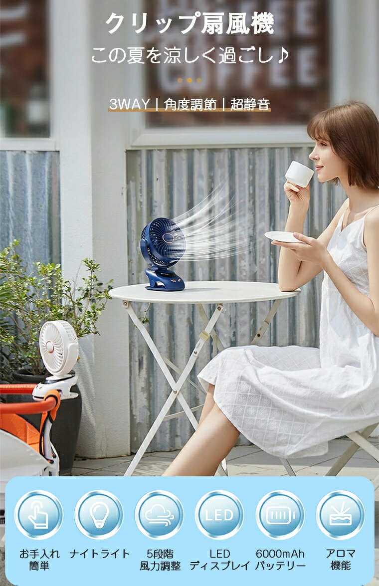 ★素材 ・ABS ★入力/出力 ・5V/1A ★角度調整 ・90°調整可能 ★風量 ・5段階 ★充電時間 ・約4〜5時間 ★電池容量 ・6000mAh(18650li-ion) ★使用時間 ・フル充電、低速で最大約24時間連続使用可能 ★パッケージ内容 ・扇風機 ・USBケーブル ・アロマシール ・ ・(充電器付属されていません) ★生産国 ・中国 ★注意事項★ ※撮影の為、画質等の関係上、色などが実際の商品と若干違ってしまうこともあるかもしれませんがご理解のほどご入札ください。予めご了承ください。 ※製造時期によりデザインや仕様に若干の変更がある場合がございます。予めご了承ください。-商品ポイント- 【LEDディスプレイ】 風量と電力量をデジタルで表示することで、ひと目で電池残量がわかり、電気が少なくなったらすぐにわかります。 【超静音設計】 より静かで、作動音が気づかれないほど扇風機です。静音モード搭載で16dB以下なので、一晩中安眠できます! 【卓上・クリップ・壁掛け】 空間制限なし、クリップ/スタンド/壁掛け、いろいろなシーンで大活躍! 【涼風にかぐわしい香りがする】 扇風機のアロマシートに好みの香りのエッセンシャルオイルを数滴垂らして、アロマプレートは、涼しい風の中にほのかな香りを漂わせます。 【ナイトライト】 LEDライトを搭載しており、夜のキャンプに最適、明かりを楽しみながら涼しい風を楽しめます。 【90°に調節可能・風量5段階調節】 手動で左右、上下に90度の調整が可能、どんな向きにも涼しい風を届けてくれます。風力は5段階で切り替え可能、お好みに合わせて自由に風量の調節ができます。 【お手入れ簡単】 特殊なツールが必要なく、扇風機の前カバーを外せますので、扇風機のお手入れは簡単にできます。