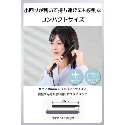 ↑↑↑正確な在庫状況は上記バナー「在庫状況を確認する」をクリックして頂き、必ずご確認ください。 ■コンパクトサイズで動かしやすく、根元から毛先まで細かなアレンジが可能なストレートヘアアイロンです。■ナノセラミックコーティングで、ツヤと動きのある美しい仕上がりを実現します。TS367AK電源方式:AC100-240V 50/60Hz 消費電力:26-27W プレートサイズ:18mm×77mm 温度調節幅:140℃、170℃、200℃(3段階 30℃刻み)立ち上がり時間:約30秒(最高温度設定時100℃到達時間)コーティング:ナノセラミックコーティング スイッチ:電源スイッチ/温度切替スイッチ 外形寸法:幅約230mm×奥行約25mm×高さ約28mm(収納時)、幅約230mm×奥行約25mm×高さ約71mm(使用時・プレート開の状態)質量:220g(コード込み)主材料:PET カラー:ブラック コード長:1.7m 温度ロック機能:× 温度メモリー機能:○ 自動電源OFF機能:○(約30分後)開閉ロック機能:○ ラク抜きプラグ:× 海外使用:○ 付属品:専用ポーチ(耐熱温度140℃)パーツ:専用ポーチ(耐熱温度140℃)(TA035110)保証期間:1年間ボブ〜ショートヘアや前髪のセットにおすすめ