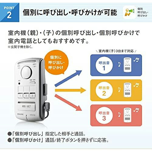 ↑↑↑正確な在庫状況は上記バナー「在庫状況を確認する」をクリックして頂き、必ずご確認ください。 ■ワイヤレス通信で、取り付けが簡単なインターホン■ライフスタイルに合わせて選べる多彩な機能を完備しています■増設用室内機(子)は、ニッケル水素充電池(内蔵)ですので、室内移動が可能です■壁掛スタンド、専用ACアダプター付属。 親機1台に対し、室内機(子)3台まで設置可能です■増設することで、宅内コミュニケーションにも利用できる、便利な製品ですDWA20R標準規格:ARIB STD-101準拠 周波数:1,895.616〜1,902.528MHz(1.728MHzStep) 通信方式:時分割多元接続方式(TDMA)通話可能距離:室内機(親)間:約100m(見通し)、増設室内機(子)間:約200m(見通し)室内機(親)中継による。 防水性能:IPX4(防沫型) 連続通話時間:最大5時間(満充電時)。※玄関子機との通話は最大3分間(3分間で自動停止)電源:専用ニッケル水素電池2.4V 500mAh(付属)、充電用ACアダプター(付属)※充電時間:最大10時間(満充電まで) 消費電力:待機時 0.1W、待機時 0.01W 着信音:室内機用3種類 音量設定:呼び出し音量 5段階、通話音量 4段階、着信音量 6段階 待受時間:約100時間(満充電時)使用温度範囲:-10〜+40℃ 外形寸法:120×60×24.4mm 質量:約120g(電池含む、壁掛けスタンド除く)付属品:室内機ボタンラベルシート 1枚、壁掛けスタンド 1個、充電用ACアダプター 1個、専用充電池パック 1個、壁取付用ネジ:(M4×16mm)2本、取扱説明書(保証書付、保証期間 1年間)1部ワイヤレス通信で、取り付けが簡単なインターホン