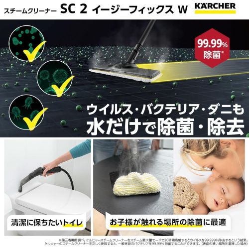 商品の在庫状況は下表の「商品のみ」のページへ移動してご確認ください。長期保証は法人様(個人様以外)の加入、業務での使用は保証外となります。必ず長期保証のサービス内容、規定を予めご確認ください。長期保証をご希望されない場合は下記の表より「商品のみ」のページへ移動してご注文ください。 ■蒸気の力で汚れを落とす、スチームクリーナー■スタンダードなモデルで、初めてスチームクリーナーを使う方に最適■家中いろいろ使えてとても便利な1台15126110SC2E●パワフルで安定のケルヒャースチームケルヒャーの技術でスチームを吐出口で約100℃を保ち、掃除で最高の結果を生み出します。●洗剤などの化学製品不要高温スチームで汚れをしっかり拭き取り、除菌、カビ菌やウイルスの除去もできます。水だけで洗剤を使ったときのような仕上がりに。エコで環境に優しく、こどもやペットに安心です。●いろいろな場所のお掃除に付属のアクセサリーを使って、いろいろな場所を簡単に掃除できます。清掃場所の一例:リビングやキッチンの床の汚れ、浴室のカビ、換気扇などのキッチンまわりの油汚れ●使いやすいアクセサリー取り付け・外しが簡単で使いまわしの良いアクセサリー、掃除のストレスが軽減します。●実はコスパ最高のスチームクリーナー1台でいろいろな場所の掃除ができる上に、除菌もできます。洗濯ができないカーペットや布製ソファにも使えます。また洗剤やアルコールを買う必要がないので、コストパフォーマンスは最高です。●アクセサリー収納ホルダー作業を一時中断する際に便利なフロアノズルホルダーとアクセサリー収納。●ノズルジョイントが自由自在に動くフロアノズル、クロスの交換が簡単で便利な面ファスナーを採用家具の下や部屋の隅も、拭きムラ拭き残しなくラクにお掃除できます。 大きなタグと面ファスナー採用により、手を汚さず簡単にクロスを交換できます。●安全ロック機能安全ロックをすることで、やけどなどの事故を防ぎます。電源:100V/50-60Hz消費電力:1500W本体寸法(約):幅254×奥行380×高さ260mm本体質量(約):2.9kg最大スチーム吐出圧力:0.32MPaスチーム温度(約):100℃噴射待ち時間(約):6分連続噴射時間(約):30分ボイラー容量(約):1L防水性能:IPX4電源コード長さ(約):4m付属品:イージーフィックス用マイクロファイバークロス、ハンドブラシ用マイクロファイバーカバー、ボイラー洗浄剤パウダータイプ×3、ノズルヘッド、ハンドブラシ、ブラシ(黒)、ブラシ(黄)、取扱説明書、フロアノズルイージーフィックス、延長パイプ(0.5m)×2しっかりお掃除できる定番モデル