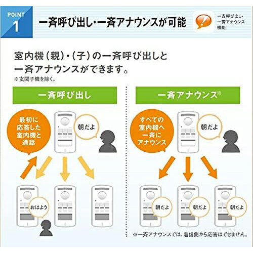 商品の在庫状況は下表の「商品のみ」のページへ移動してご確認ください。長期保証は法人様(個人様以外)の加入、業務での使用は保証外となります。必ず長期保証のサービス内容、規定を予めご確認ください。長期保証をご希望されない場合は下記の表より「商品のみ」のページへ移動してご注文ください。 ■ワイヤレスインターホン室内機(親)と玄関子機のセット品です■配線工事不要で設置してすぐに使用できます■通信はDECT準拠方式です■通話可能距離は見通しで最大100mです■室内機(親)はシンプル操作のため高齢者の方にも簡単に使用できます■大きく見やすい着信ランプで玄関子機からの呼び出しが一目でわかりますので着信音が聞き取りにくい高齢者でも着信が分かりますDWA20BDセット内容:室内機(親)、玄関子機 標準規格:ARIB STD-101準拠 周波数:1,895.616〜1,902.528MHz(1.728MHzStep) 通信方式:時分割多元接続方式(TDMA)通話可能距離:約100m(見通し)※玄関子機と増設室内機(子):約200m(見通し)室内機(親)中継による。 増設子機の登録台数:室内機(親)のみ:室内機(子)3台、玄関子機 2台 登録可能 防水性能:玄関子機のみ:IPX3(防雨型) 連続通話時間:最大3分間(3分間で自動停止)電源:室内機(親):専用ACアダプター(付属)使用、玄関子機:単3アルカリ乾電池×2本(市販品) 消費電力:室内機(親)のみ:通話時 0.66W、待機時 0.53W 消費電流:玄関子機のみ:通話時 約77mA、待機時 約20μA 電池寿命:玄関子機のみ:約1年(通話時間10秒、1日5回の目安)着信音:室内機(親)のみ:室内機用3種類、玄関子機用2種類 選択 音量設定:室内機(親)のみ:呼び出し音量 5段階、通話音量 4段階、着信音量 6段階 使用温度範囲:室内機(親):-10〜+40℃、玄関子機:-10〜+50℃ 外形寸法:室内機(親):120×60×24.4mm、玄関子機:131×98×33mm 質量:室内機(親):約90g(壁掛けスタンド除く)、玄関子機:約230g(電池除く)付属品:室内機ボタンラベルシート 1枚、壁掛けスタンド(室内機用)1個、専用ACアダプター 1個、壁取付用ネジ:室内機(親)用(M4×16mm)2本、玄関子機用(M4×25mm)2本、玄関子機用小ネジ(M4×18mm)2本、アンカー 2本、取扱説明書(保証書付、保証期間 1年間)1部ワイヤレスインターホン室内機(親)と玄関子機のセット品