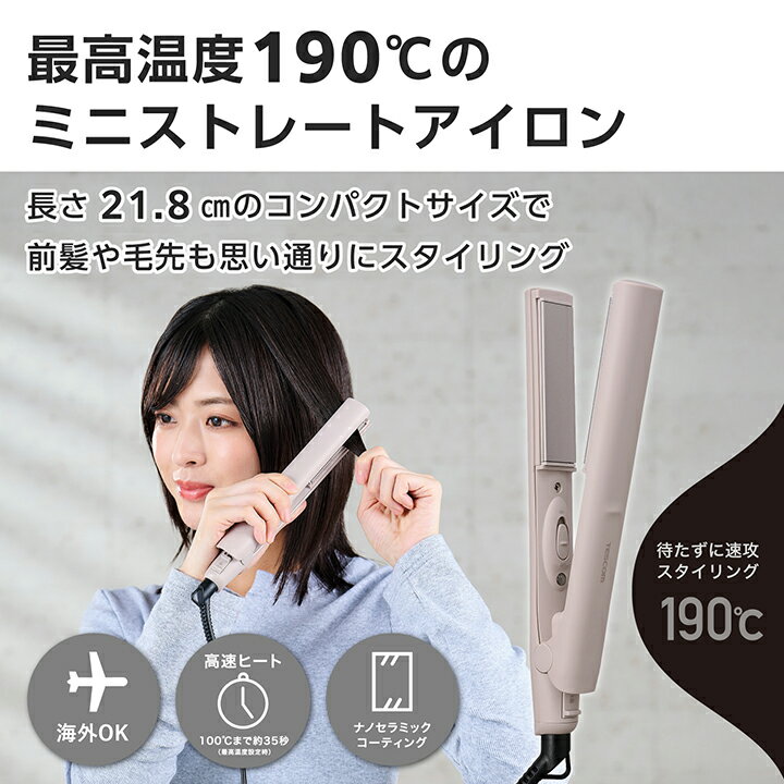 ■コンパクトでも実力派!最高温度190℃で本格スタイリングができるミニストレートアイロンです。ナノセラミックコーティングで摩擦ダメージを軽減しながら、両面3D「ぴたっと」プレートが髪をしっかりキャッチして、ストレートはもちろん、毛先カールや寝癖直しも思いのまま。海外対応で旅行にも便利です。■最高温度190℃で、コンパクトでも本格的なスタイリングができます。■コンパクトでも髪をしっかりとらえる横幅20mmのプレートで時短ストレート。ストレートはもちろん、毛先ワンカールもできます。トップ立ち上げ、寝癖直しや毛先のニュアンスカールなどにもおすすめです。■旅行にも持って行きやすいコンパクトサイズ。かばんに入れてもかさばりません。■すべりやすさ32%UP!粒子が細かい「ナノセラミック」を配合したコーティングで、摩擦ダメージに配慮した、ひっかかりのないスムーズな髪すべりを実現します。 ※チタンコーティングの当社ヘアアイロンとの比較■両面3D「ぴたっと」プレートを搭載し、髪の流れに沿って両面のプレートが上下左右に傾いて、細かな毛束にもしっかり密着。毛先まで逃さず、しっかりキャッチして整えます。■上下プレートを温めるダブルヒーターを採用し、電源を入れてから約35秒で使用可能な温度に到達。スピーディーな立ち上がりで、時間のない朝でも焦らずにスタイリングできます。 ※最高温度設定時の100℃到達時間■プレートを閉じた状態でロックが可能。収納する時や旅行などの持ち運びにも便利です。■持ち物やインテリアに馴染む、上品なマット質感のブラック&グレージュの2色展開です。■電源コード根元のフック穴でS字フックなどに吊るして収納できます。場所を取らず、使いたい時にサッと取り出せます。■電源コードの根元部分が360度回転するので、ねじれにくく使いやすいです。■クイックコードバンド付きなので、ばらつきがちな電源コードもすっきりまとまり収納も簡単にできます。■AC100V-240Vの地域で使用できます。海外旅行の際にも使えて便利です。■※国や地域によりプラグ形状が異なります。別途変換プラグをご用意ください。■1965年の創業以来、テスコムが製造・開発してきた業務用ドライヤー『Nobby』は、高い性能からサロンシェアNo.1(数量ベース)(※)を獲得。その技術力が生かされています。■※2024年4月〜2025年3月の国内美容院(サロン)への業務利用ドライヤー販売荷数(サロンでの販売分除く)(東京商工リサーチ調べ)■サイズ:幅約218mm×奥行約27mm×高さ約76mm■質量:約230g(コード込み)■消費電力:21W-25W■電源方式:AC100V-240V 50Hz/60Hz■スイッチ:電源スイッチ「ON - OFF」■立ち上がり時間:約35秒(最高温度設定時の100℃到達時間)■コーティング:ナノセラミックコーティング■アイロンプレートサイズ:幅約20mm×高さ約77mm■温度調節幅:OFF/190℃■主材料:PA66■開閉ロック機能:〇■ラク抜きプラグ:×■海外使用:○■カラー:グレージュ■コード長:1.5m■保証期間:1年間エレコムダイレクトショップ