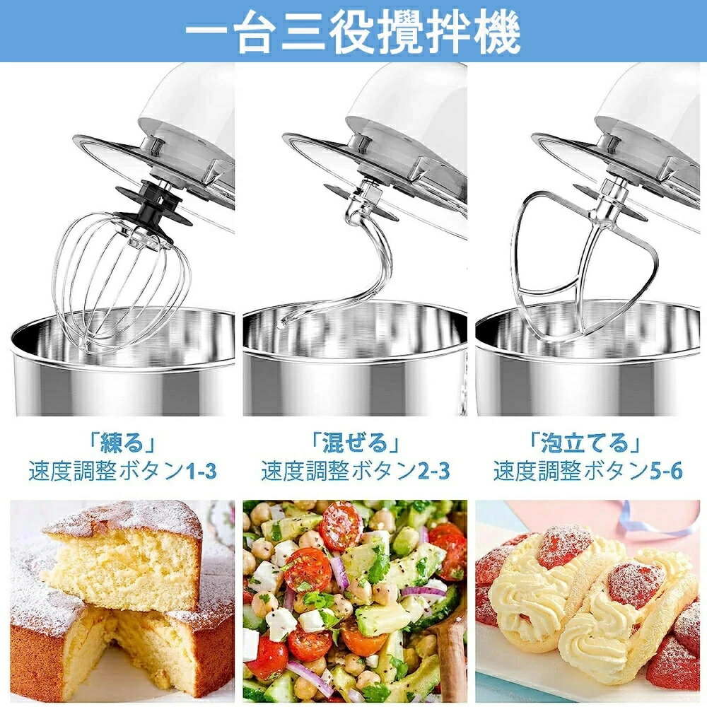 スタンドミキサー 大容量 3種類アタッチメント付き 低騒音 6段階スピード調節 家庭用 業務用 こねる 多機能 ミキサー 電動 お菓子 パン 手作り キッチン フードプロセッサー