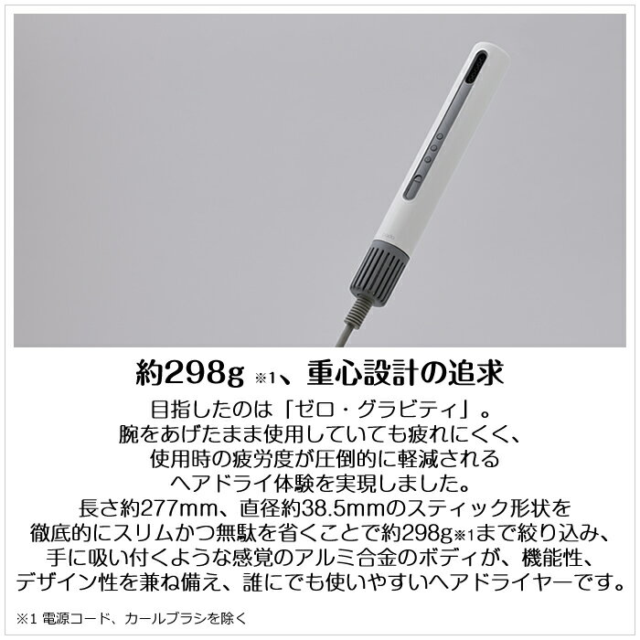 ※従来モデル(BD-S1)に比べ、カールブラシの強度アップと送風時の風の流れがより良くなるように改良。◎このスティックが毎日を変える 2017年より5年以上の歳月を費やし、理想のドライヤーの形を追求した独自の発想をもとに、軽量化と効率的な送風機能の両立を、リレー競技用バトンのサイズで実現しました。cadoが追求し続けた理想のカタチ「baton(バトン)」が、毎日のヘアドライを「疲れず」「早く」「思い通り」にします。■約298g ※1、重心設計の追求 目指したのは「ゼロ・グラビティ」。腕をあげたまま使用していても疲れにくく、使用時の疲労度が圧倒的に軽減されるヘアドライ体験を実現しました。長さ約277mm、直径約38.5mmのスティック形状を徹底的にスリムかつ無駄を省くことで約298g※1 まで絞り込み、手に吸い付くような感覚のアルミ合金のボディが、機能性、デザイン性を兼ね備え、誰にでも使いやすいヘアドライヤーです。※1 電源コード、カールブラシを除く■業界トップクラス※2 の風量 スティック形状は、ただコンパクトなだけではありません。超軽量パワフル、カドーHSDCモーターを新開発し、定格消費電力800Wの省エネ設計ながら、業界トップクラス※2 の約2.0m3/minのパワフルな風量を実現。cadoが空調家電で培ってきた送風技術を応用し、大きいドライヤーこそがパワフルという常識を覆します。※2 国内家庭用ヘアドライヤーにおいてメーカー調べ(2022年10月現在)■独自スティック形状。直進性のある風で、髪の根元から速乾乾燥 ドライヤーと髪の理想的な距離は約20cm。ノーズレスのスティック形状は自然と腕を上げるだけで、この最適な距離感を実現。狙ったところに最適な風と熱を、頭頂部から毛先まで的確に風を届け、乾きにくい後頭部も効率的に時短乾燥ができます。通常のノーズがついたドライヤーでこの最適なドライを行うとか なり腕に負担がかかる一方で、スティック形状のbaton(バトン)はラクにドライ可能です。■髪に優しい、スタイリングする風温調節 風温調節は4段階(高温/中温/低温/スタイリング※3)で、あえて最高温度を熱すぎない85℃に設定することで髪へのダメージを抑え、過乾燥を防止。ブランド独自のハニカムベント(吹出口)とカールブラシプレートに遠赤外線を放射するコーティングを施した、デュアル遠赤外線構造に加え、マイナスイオンを含んだ温風で髪と地肌をやさしくケアします。※3 風温をスタイリングに設定すると温風と冷風が交互に切り替わります。■2 in 1で楽々。カールブラシで手軽にスタイリング カールブラシをマグネットで簡単装着でき、カールドライヤー としても一台で賄えて、スピーディーにスタイリング可能です。こうしたコンパクトなドライヤーワークは髪のボリューム コントロールも細かく調整可能。サイドは抑えたり、トップにボリュームを持たせたり、エアリーカールなどスタイリングまで一貫して行うことができます。■コードが360度回転するノンツイスト機構搭載 ノンツイスト機構を搭載しているため、コード部分が360度回転します。コードが絡まる煩わしさを解消します。■スペースにも置きやすい、コンパクトの追求 スリムなスティック形状は、限られた洗面台スペースでも、ドレッサーのわずかなスペースにもコンパクトに収まります。毎日使うものだからこそを考えてのコンパクトの追求でもあります。■圧倒的なポータビリティ スリムなスティック形状のため、ショートトリップや出張のときに小型カバンに入れてもストレスなく持ち運ぶことが可能。旅先でもいつもと同じスタイリングを楽しむことができます。■薄型コンパクトサイズで持ち運びに最適 付属するポーチは薄型コンパクトサイズで持ち運びに最適。開閉しやすいオープンファスナー。カールブラシも収納できるポケット付きのため機能的に収納もできます。■cadoが追求し続けてきた理想のカタチ カドー空気清浄機は、世界 No.1の性能をたずさえて 2012年デビューしました。日本メーカーとして初めてCADR最高値を獲得。世界に誇れる性能と、普遍的な美しさをあわせ持った革新的なプロダクトにより、暮らしの質を向上する価値提案に日々挑んでいます。空気清浄機でスタートした我々、実は、ヘアドライヤーの開発は 2017年から行っています。ドライヤーに当たり前についていたノーズをなくすことに始まり、機能追求にもとづいたプロダクト開発を続けてきました。■電源:AC 100V 50 -60Hz■消費電力:約800W(高温強風・最大出力時)■風量:約2.0m3/min■サイズ:高さ約277mmx直径約38.5mm■質量:約298g(電源コード、カールブラシを除く)※電源コードを含む全体の重さは約440g(カールブラシは含まず)になります。■電源コード長さ:約1.7m■安全装置:温度過昇防止装置(サーモスタット・温度ヒューズ)■付属品:カールブラシ、携帯ポーチ、取扱説明書(保証書)※日本国内専用となります。商品の特長・仕様に関する詳細はメーカーホームページでもご覧頂けます。cado ス