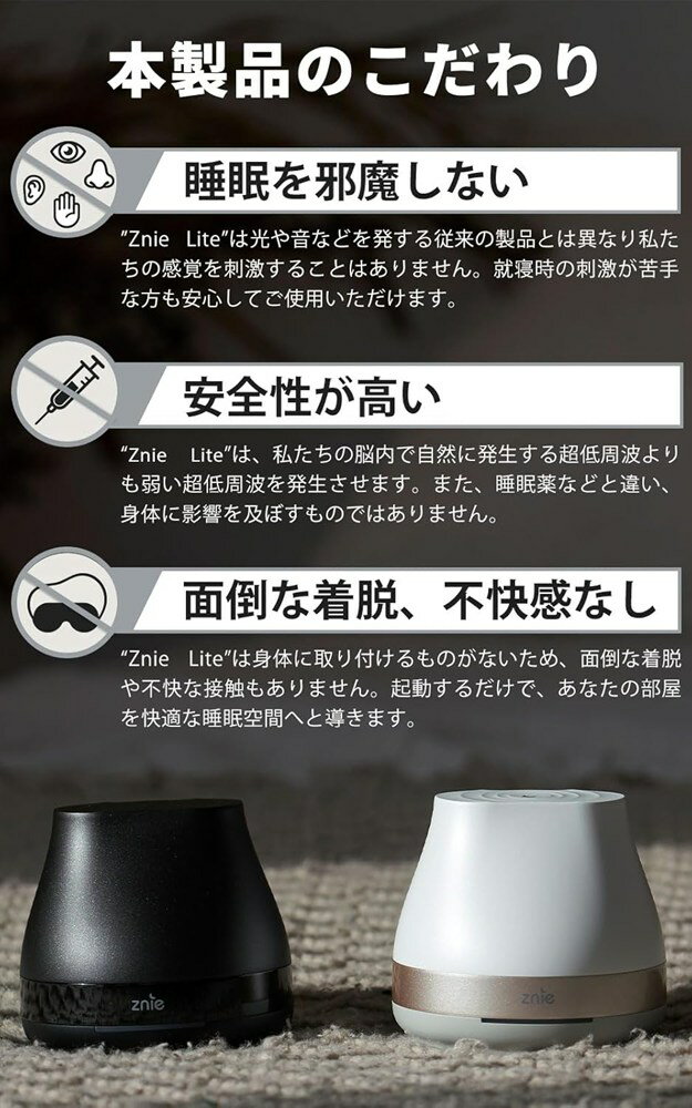 安心梱包についてこちらの商品は通常梱包となります。安心梱包は別途、下記ご注文ページより商品と一緒にご注文下さい。■『Znie Lite』は、快適な睡眠習慣をサポートするために設計されたスリープテックデバイスです。入眠や眠り続けるのに苦労している人に向けて開発されました。超低周波 (ELF)を生成する『Znie Lite』は、五感を刺激しすぎたり、ライフスタイルを大きく変えたりすることなく、健康的な睡眠スタイルを提案します。■『Znie Lite』は他の睡眠サポート製品と比較して、感覚疲労が無いことが大きな特徴です。そのため、家族やパートナーと同じ部屋で寝ている方にもお勧めです。直接脳波に働きかける『Znie Lite』は音や光等を発さないので、誰にも迷惑をかけずに、睡眠習慣をサポートします。商品サイズ:10 x 10 x 7×4 cm重量:400gパッケージサイズ:14.3 x 13.3 x 12.4 cm材質:ABS、ポリカーボネート生産国:韓国■商品の特長・仕様に関する詳細はメーカーホームページでもご覧頂けます。Znie Lite P-100-BK ブラック Honey IT INC.■送料区分:60サイズ