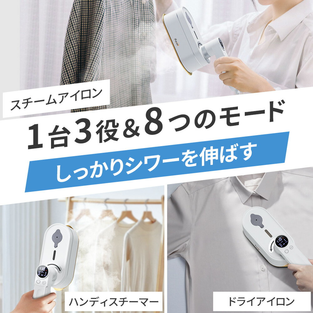 スチームアイロン 15秒立ち上がり パワフルスチーム 8つモード 7段階温度調節 アイロン スチーム ハンガーにかけたまま 清浄機能搭載 衣類スチーマー 1台3役 シワ伸ばし ハンディ 軽量 小型 パワー 除菌 脱臭 ハンディスチーマー