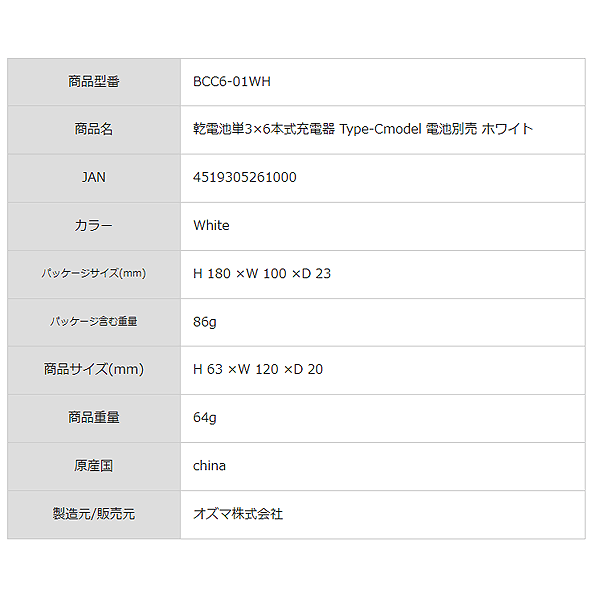 OSMA オズマ BCC6-01WH 非常用スマホ充電器 LEDライト 単3×6本タイプ Type-Cポートタイプ 電池別売 ホワイト BCC601WH「送料無料」