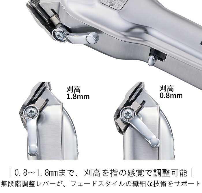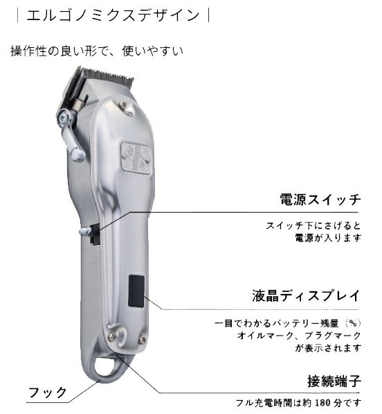 切れ味、スタイル、使い心地 すべてを極めたメタルクリッパー 目を引くデザイン性と、ハイパワーで安定した使い心地 |0.8~1.8mmまで、刈高を指の感覚で調整可能| 無段階調整レバーが、フェードスタイルの繊細な技術をサポート |エルゴノミクスデザイン| 操作性の良い形で、使いやすい |滑らかな切れ味| 耐久性があり、切れ味が鋭い。ステンレス刃で滑らかな切れ味を実現 |リチウムバッテリー| 電池残量に関係なく回転数を維持大容量の2500mAhで連続使用時間180分! |一目でわかる電池残量| 液晶ディスプレイにバッテリー残量が表示。充電忘れを防止 スペック 製品名:ブレーメン メタルクリッパー サイズ / 重量:184×60×46mm / 366g 刈高 / 刈幅:約0.8mm~1.8mm / 45.5mm 電源方式 / 入力電源:充電式・USB式 / DC5V 1A 使用電池 / コード長:リチウムイオン電池(2500mAh) / 約1.0m 充電時間 / 使用時間:約180分 / 約180分 材質:ステンレス、アルミ 付属品:アタッチメント4種(1.5/3/4.5/6mm)、ブレードカバー、掃除ブラシ、USBケーブル、オイル ●型番:MC-24D01 ●JAN:4989550232580 美容・健康家電 製造販売:トリコインダストリーズ 広告文書:株式会社デュオドリーム