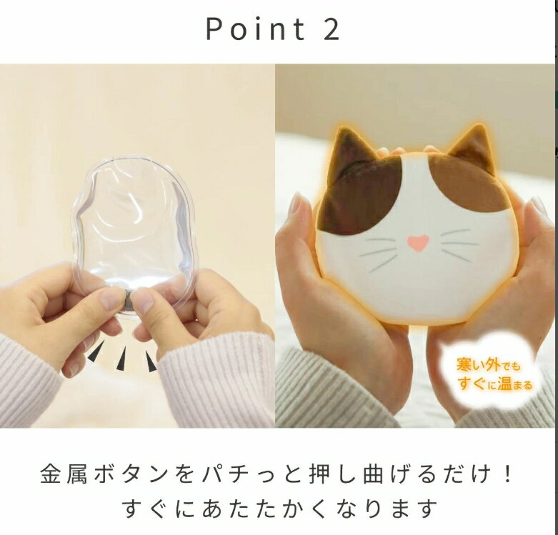 商品名NECO ネコ カイロ 商品説明繰り返し使えてぽかぽかあたたかくなるねこ型カイロ。 <繰り返し使える!エコカイロ> 鍋などで5〜8分ほど煮て常温になったら再度使えるエコなカイロです。 <金属ボタンを押し曲げるだけ> 金属ボタンをパチっと押し曲げるだけ!すぐにあたたかくなります。 <ミニカイロカバーとしても使える> 市販のミニカイロカバーとしても使えます。 カバーはキュートな、ねこのデザイン! ねこの柄は全部で8種、 お気に入りのねこちゃんを見つけてみてください♪ <手のひらサイズでコンパクト!> コンパクトなので持ち運びにも便利! 冷える時のお供にオススメです。 サイズカイロ本体サイズ:W110×D15×H90mm 種類ミケ/ハチワレ/サバトラ/茶トラ お選びください。 素材(カイロ)酢酸ナトリウム、PVC、ステンレス (カバー)ポリエステル 使用方法1、カイロ本体の金属ボタンをパチっと押し曲げます。 ※反応しない場合、数回押し曲げてください。 2、ゆっくり1秒ほどで戻すと液体が白く結晶化し発熱します。 だんだんと白くなりあたたかくなります。 3、発熱したら、カバーに入れてご使用ください。 4、30〜50分程あたたかさがつづきます。 ※使用時間は環境により前後します。 原産国中国