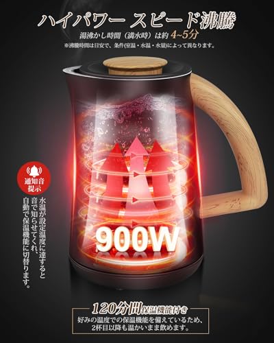 木目調/-/MK607A・Color:木目調・【便利な7段階温度調節・デジタル表示】日常生活でのお湯の使い道は様々ですが、沸騰機能しかない電気ケトルの場合、わざわざ温度を測らなければいけないので不便です。特に使用する機会が多い飲み物類や調理の際には、求められる最適な温度がそれぞれ異なります。Aliliy電気ポットは7段階(45/55/65/75/85/92/100℃)の温度設定機能付き、コーヒー・紅茶・ミルク・カップ麺などの用途に合わせて温度設定ができます。さらに、温度が本体に直接表示され、現在温度と設定温度を一目で確認できますので便利です。・【900Wスピード湯沸かし・2時間保温機能】湯沸かしケトルは900Wのハイパワーにより、満水時(800ml)でも約3?5分と素早く沸騰させます。※室温25℃、水温25℃の場合。沸騰時間はあくまで目安で条件(室温・水温・水量)によって異なります。設定温度になると、ケトルが「ピーッ」と音で知らせ、自動で保温機能に切り替わります。120分の保温機能を備えているので、2杯目のお茶やコーヒー、スープも再沸とうの必要がなくすぐに楽しめます。・