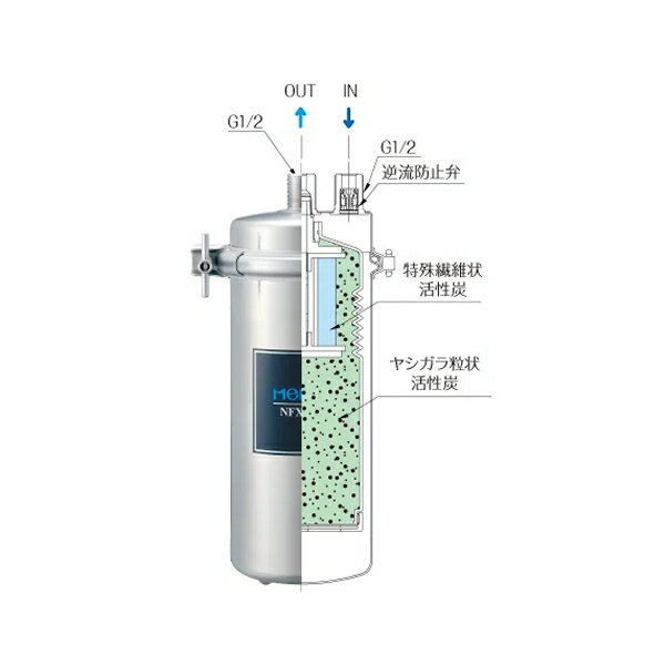 商品の特徴 MEISUI(メイスイ) 業務用浄水器 1形 NFX-MC 本体 + カートリッジ NFXシリーズの主な特長 ●ミネラル分を残して、不純物や臭いを除去。 水をおいしくする成分・ミネラル分はそのままに、遊離残留塩素やカビ臭、総トリハロメタンなどの有機塩素化合物を取除きます。 ●高機能な特殊フィルターでしっかり浄水。 高品質のヤシガラ粒状活性炭、イオン交換繊維を配合した特殊繊維状活性炭、細かい不純物をろ過する中空糸膜※で、臭いや一般細菌まで取除きます。 ※NFX-LZのみの仕様です。 ●設置場所に合わせたバリエーションをご用意。 ●NFX-MC・NFX-LC・NFX-OC ヤシガラ粒状活性炭+特殊繊維状活性炭タイプ 2種類の活性炭を組み合わせることで、ろ過能力を高めました。 吸着スピードが速く、遊離残留塩素やカビ臭、総トリハロメタンなどの有機塩素化合物をより多く取除きます。 用途、設置スペース、水の使用量に合わせて選べる浄水器の性能と、サイズバリエーションを4タイプご用意しています。 ●NFX-LZ ヤシガラ粒状活性炭+特殊繊維状活性炭+中空糸膜タイプ 2種類の活性炭と中空糸膜と組み合わせたものです。 活性炭層で遊離残留塩素やカビ臭、総トリハロメタンなどの有機塩素化合物を、中空糸膜で0.15ミクロン以上の不純物 (濁り、アルミニウムなど) を取除きます。 MEISUI(メイスイ) 業務用浄水器 仕様一覧 NFX-MC NFX-LC NFX-OC NFX-LZ 専用カートリッジ 専用カートリッジ 専用カートリッジ 専用カートリッジ 種類 I形 ろ過流量 5.0L/分 5.0L/分 8.0L/分(0.15MPa時) 4.0L/分 ろ材 不織布・ヤシガラ粒状活性炭 特殊繊維状活性炭 (イオン交換繊維配合) 不織布・ヤシガラ粒状活性炭 特殊繊維状活性炭 (イオン交換繊維配合) 中空糸膜 浄水能力 遊離残留塩素 (2.0mg/L時) 50,000L 100,000L 300,000L 100,000L 濁り (濁度:2度時) ─ ─ ─ 20,000L 総トリハロメタン (0.100mg/L時) 15,000L 25,000L 35,000L 25,000L CAT(シマジン) (0.0030mg/L時) 50,000L 100,000L 200,000L 100,000L 溶解性鉛 (0.050mg/L時) 20,000L 20,000L 30,000L 20,000L 2-MIB(カビ臭) (0.00005mg/L時) 20,000L 50,000L 50,000L 30,000L テトラクロロエチレン (0.010mg/L時) 50,000L 100,000L 200,000L 100,000L トリクロロエチレン (0.030mg/L時) 50,000L 100,000L 200,000L 100,000L 1,1,1-トリクロロエタン (0.300mg/L時) 10,000L 20,000L 30,000L 20,000L 使用可能水圧 0.1〜0.75MPa (1.0〜7.6kgf/cm2) 0.15〜0.75MPa (1.5〜7.6kgf/cm2) 0.1〜0.75MPa (1.0〜7.6kgf/cm2) 耐圧性 1.75MPa(17.8kgf/cm2)× 1分間適合 重量(満水時) 1.6kg(2.9kg) 1.9kg(3.5kg) 2.5kg(4.5kg) 2.1kg(3.1kg) ろ材使用限界 12ヶ月以内 最高使用温度 35℃ 配管接続口径 G1/2 サイズ(mm) 直径104 × 高さ245 直径104 × 高さ303 直径104 × 高さ384 直径104 × 高さ303 ※浄水能力は、JIS S 3201家庭用浄水器試験方法に基づく試験結果です。 ※硬水を軟水にかえることはできません。 ※遊離残留塩素0.1mg/L以上の水道水にのみお使いください。 ※ウォーターハンマーが発生する時は、浄水器の手前で必ず減圧弁を設置してください。 ※製品のデザイン・仕様は改良などのため予告なく変更する場合があります。