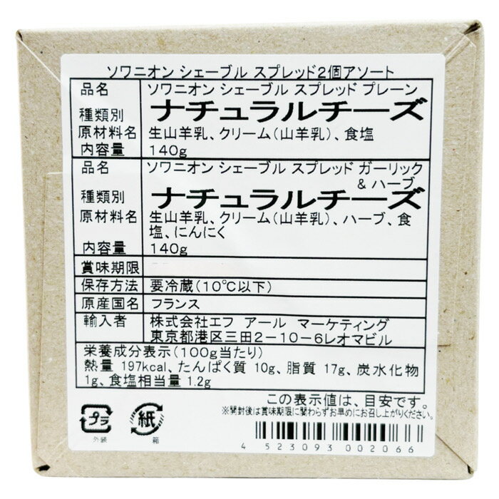 ソワニヨン シェーブルスプレッドアソートは、フランスの伝統的な料理であるソワニヨン(玉ねぎのスープ)をイメージしたチーズスプレッドです。プレーンとガーリック&ハーブの2種類の味が楽しめるセットになっています。 プレーンのシェーブルスプレッドは、濃厚なチーズの風味と滑らかなテクスチャーが特徴で、素材の旨みが存分に味わえます。一方、ガーリック&ハーブのシェーブルスプレッドは、香り高いニンニクとハーブの風味が加わり、さらにおいしさが引き立ちます。 パンやクラッカー、野菜などと一緒に食べると、さっぱりとした味わいが口の中に広がります。おつまみやカナッペ、料理のトッピングなど様々なシーンで楽しむことができるアイテムです。
