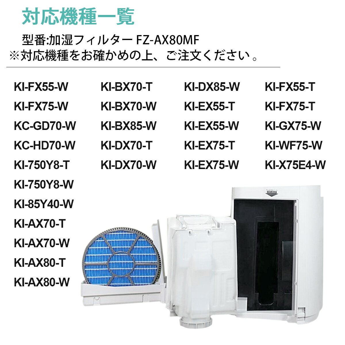 商品説明: ● シャープ加湿空気清浄機交換用 加湿フィルター FZ-AX80MF 「互換品」 加湿機能 防菌 防カビ。交換の目安(1枚):約2年、使用時間や設置場所により交換時期は異なります。 ● 本品は消耗品です。汚れが目立ち効果が落ちているようでしたら、速やかに交換することをおすすめいたします。 ● 交換用 Ag+イオンカートリッジ FZ-AG01K2 「互換品」。交換の目安(1個):約1年、1日平均2.5Lの水を使用した場合(総使用量900L)が交換の目安です。 ● タンクキャップに装着することで、タンクやトレーのヌメリやニオイの原因となる菌を除菌する。本品を取り付ける前に、タンク・トレー・加湿フィルターのお手入れをしてください。 ● 本品は消耗品です。水質、使用環境によっては交換時期が早くなることがあります。 加湿フィルター FZ-AX80MF と Ag+イオンカートリッジ 対応機種一覧: KC-GD70-W、KC-HD70-W、KI-750Y8-T、KI-750Y8-W、KI-85Y40-W、KI-AX70-T、KI-AX70-W、KI-AX80-T、KI-AX80-W、KI-BX70-T、KI-BX70-W、KI-BX85-W、KI-DX70-T、KI-DX70-W、KI-DX85-W、KI-EX55-T、KI-EX55-W、KI-EX75-T、KI-EX75-W、KI-F75E3-T、KI-F75E3-W、KI-FX55-T、KI-FX55-W、KI-FX75-T、KI-FX75-W、KI-GX75-W、KI-H75YX-W、KI-HX75-W、KI-J75YX-W、KI-JX75-W、KI-WF75-W、KI-X75E4-W、KI-X75E6-W ※ご購入の前にご希望商品の対応機種一覧より、適合商品である事をご確認願います。 ※購入検討商品に関してご不明な点やご不安をお持ちのお客様は、ご購入前にお問い合わせください。 ※加湿フィルター次のような状態になった場合は、早めの交換をおすすめします。 ・お手入れしても、水あかやニオイが取れない。 ・変色(黒色・黄色)や汚れがひどい。 ・白い固まりが付き、加湿フィルターが水を吸い上げなくなったとき。 ・傷みや汚れ、型くずれがひどいとき。
