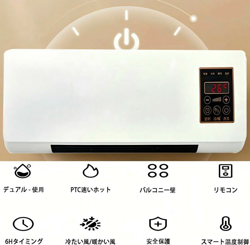 商品情報 仕様 アイテムタイプ:壁掛けエアコン 材質:ABS、PP 重量:約1800g/63.5oz 定格能力:1500w 定格周波数:50hz 電池の種類:ボタン電池×1 サイズ:55cm*24cm*12cm 梱包リスト:壁掛けエアコン×1、リモコン×1、取扱説明書×1 取り付けについて 室外機は必要がありません。 工事不要、一人でも設置可能です。 ※ご注意 冷暖房機能あるので、16〜40度温度調整できます。 冷房機能がある程度効きますが、強く効果を求める方はご遠慮ください。 冬で使うの暖房効果ほうが良いと思います。 ご了承ください。 【冷暖房】 家全体の一定温度暖房、冷暖房、光なし、低騒音、冷温2段階調節可能。 【8Hインテリジェントタイミング】 最大8時間のタイミングシャットダウン機能、夜中に起きてシャットダウンするのを避け、自然に目が覚めるまで安心して眠れます。 【リモコン】 エアコンにはリモコンが付いています。機械のスイッチを簡単に操作でき、リモコンで送風速度を調整できます。 【インテリジェントなタッチ スクリーン制御】 壁に取り付けられたエアコンは、インテリジェントなタッチ スクリーン制御をサポートし、設置が簡単で使いやすいです。 【小さいサイズ】 冬の暖房、夏の冷房、四季のニーズを満たすために、寝室、リビングルーム、オフィスなどに置くのに適した小さい 本商品は掲載されている画像と一致してエアコンファンです 壁掛けクーラーファンなので、取り付けには壁のネジを締める必要があります。 ホックの耐荷重が保証されていればホックで代用することもできますが、安全のため当店ではネジ留めを推奨しています。