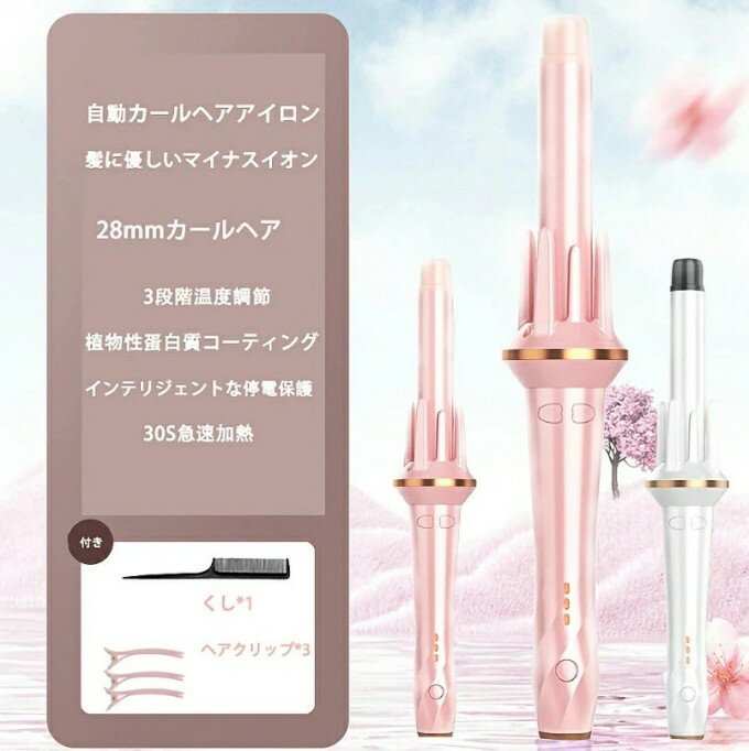 ヘアアイロン 自動カールヘアアイロン 3段階温度調節 28mm カールヘアアイロン カールアイロン 自動電源off 前髪 巻き髪 軽量 マイナスイオン アイロン レディース 携帯用 コンパクト