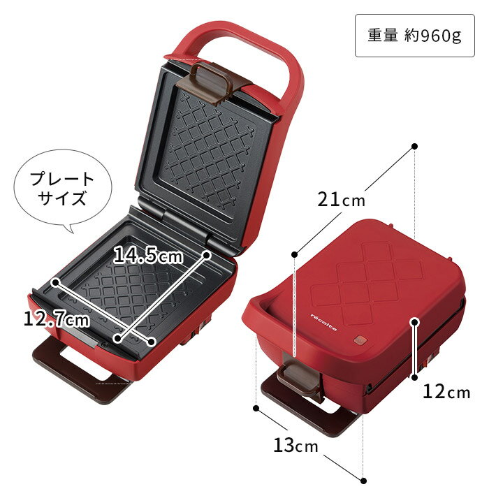 recolte プレスサンドメーカー プラッド さらに分厚く、さらに具沢山に。“萌え断”ホットサンドが5分で完成! 「プレスサンドメーカー プラッド」は、パンと具材をのせてプレスして待つだけで、誰でも簡単においしいホットサンドが作れるホットサンドメーカー。 食パンの耳までカリッと焼けるワイドなプレートサイズと、可愛い格子模様の焼き色が魅力。5段階ハンドルロックで、ライトなサンドから沢山のボリューム満点サンドまで、思いのまま。 切ったときの断面を想像しながら、“萌え断”ホットサンドに挑戦してみませんか? お子様と楽しく作る休日のサンドランチに、来客時のおもてなしスイーツに、もちろん毎日の朝食用に、活躍すること間違いなしです。 【p10】【楽天限定特典付き】 ホットサンドメーカー 電気 レコルト 耳まで ホットサンド 厚焼き フレンチトースト 1枚 カフェ cafe 子供 簡単 朝食 レシピ付き 食パン サンドイッチ RPS-2recolte レコルト プレスサンドメーカー プラッド ( ホットサンドメーカー 電気 耳まで焼ける ) 豪華 特典付き DETAIL COLOR 商品名 recolte プレスサンドメーカー プラッド 型番 / JAN マットホワイト:RPS-2(W) / 4582180201409 マットレッド:RPS-2(R) / 4582180201416 サイズ 本体: 約 幅13 × 奥行21 × 高さ12 cm プレート:約 幅12.7 × 奥行14.5cm 電源コード:約1m 重量 約960g 材質 本体:フェノール樹脂 プレート:アルミダイキャスト(ノンスティック加工) 電源 AC100V 50/60Hz 消費電力 700W 付属品 専用レシピブック 保証 お買い上げ日より1年間 備考 ・次の材料は入れないでください。液だれの多い材料(ジャムなど)、加熱により膨らむ材料、生地を流し込む材料(パンケーキなど)。 ・こびりついて取りにくい汚れや油汚れは、プレートが温かいうちに湿らせたキッチンペーパーなどで拭いてください。その際はトングなどを使用してください。 仕様変更となった旧モデルの仕様 品番:RPS-1 サイズ:本体 約 幅13 × 奥行23 × 高さ9.5 cm、プレート 約 幅12 × 奥行15 cm 重量:約1kg 電源コード:約95cm 消費電力:600W recolte ( レコルト ) シリーズは こちら ギフトバッグラッピングは こちら デザイン家電 ランキング