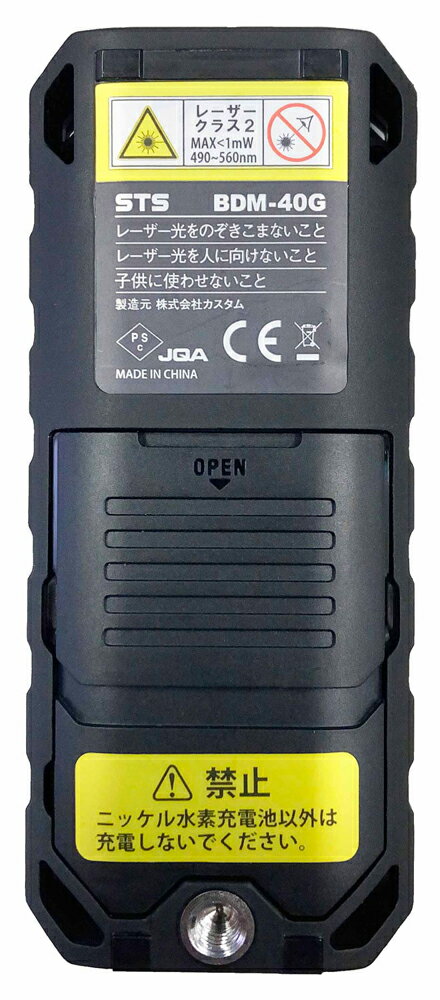 「STS グリーンレーザー距離計 40m BDM-40G」は株式会社ホームセンターセブンが販売しております。メーカーSTS品名グリーンレーザー距離計 40m BDM-40G サイズ重量商品説明●視認性の良いグリーンレーザー搭載。●安心のPSCマーク付、豊富な測定項目:距離・面積・ピタゴラス測定(3点間)、常時角度表示、バックライト機能付。●標準付属品(本体、専用ソフトケース、USBケーブル、単4充電式Ni-MH電池x3本、ストラップ)■測定範囲0.2~40m、測定精度±2.0mm■サイズ:49x115x26mm■重量:約145g(電池含む)■PSマークの種類:PSCマーク■届出事業者名:株式会社カスタム■登録検査機関名称:一般財団法人 日本品質保証機構 (JQA)※パッケージ、デザイン等は予告なく変更される場合があります。※画像はイメージです。商品タイトルと一致しない場合があります。《計測機器 作業 調査 施工管理》PSマークの種類:PSCマークPSマークの届出事業者名:株式会社カスタム商品区分:原産国:広告文責:株式会社ホームセンターセブンTEL:0978-33-2811