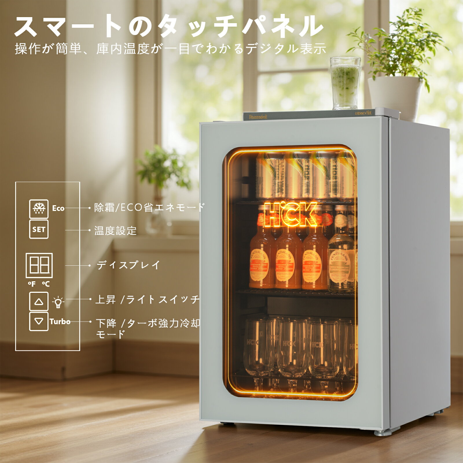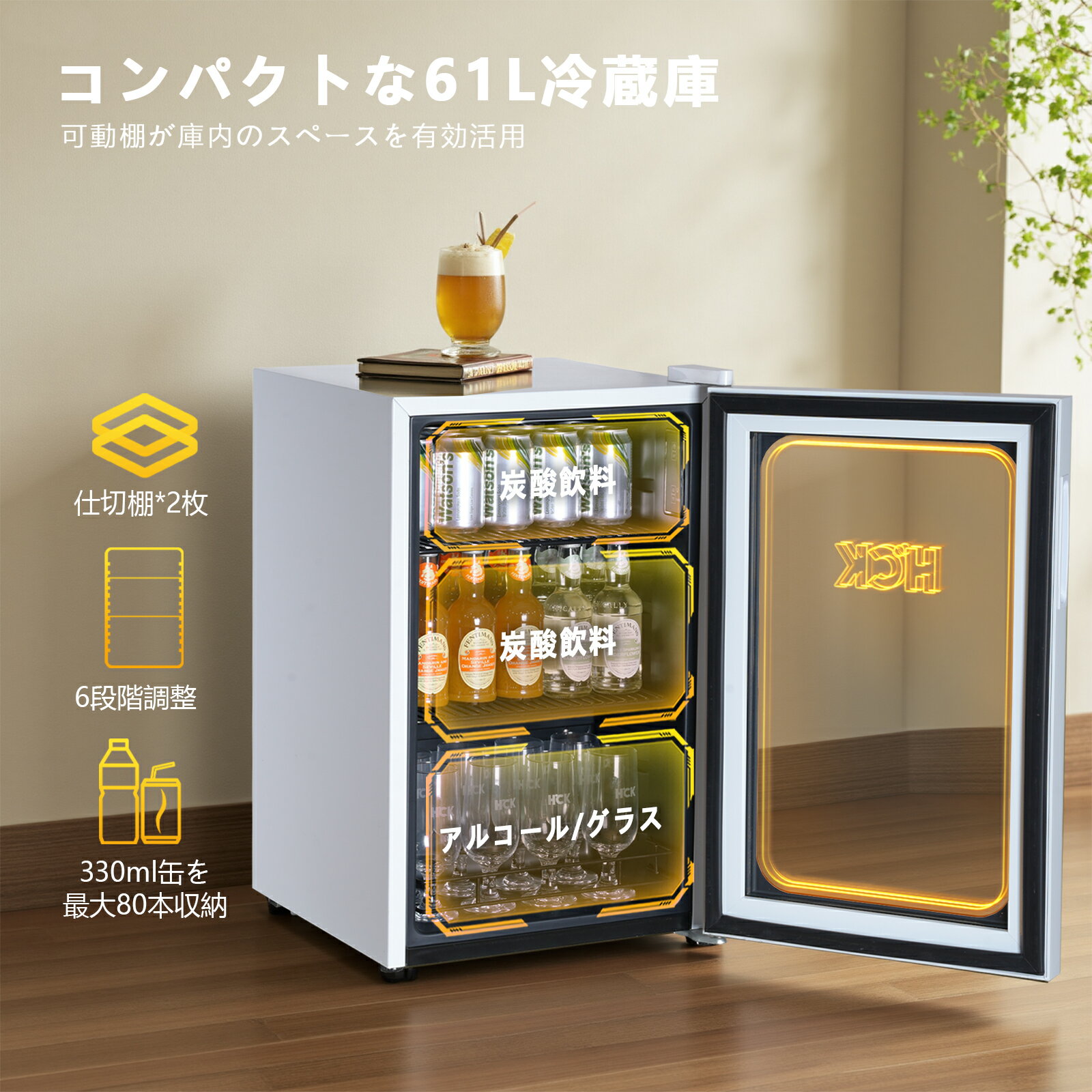 ▼商品について ●【-5℃のスムージーを新体験】本ドリンク冷蔵庫は、高い冷却性能と正確かつ安定した温度管理の技術を活用して、庫内温度を約マイナス5度まで下げることができます。-5℃の炭酸飲料は、凍ったグラスに注ぐだけで一瞬に冷凍してスムージー状態になり、いつでも家で爽やかな気分を味わえます ●【たっぷり大容量】61 Lの大容量と、調節可能な2つのプラスチック製の棚板が付属しています。コンパクトなのに見た目以上にたっぷり飲み物を保存でき、ひとり暮らしのお部屋で大活躍します。330 ml缶なら最大80 本を収納できます ●【スタイリッシュなデザイン】冷蔵庫のドアは頑丈なアクリル素材を強化ガラスで挟み込んだ三層構造になっています。外側ガラスの中空層側に発熱フィルムをコーティングし、ドアの結露を効果的に軽減します。さらに、中空層には3Dレーザーエンボス加工とLEDオレンジ色ライトが施され、スタイリッシュで美しいデザインに仕上げました ●【スマートのタッチパネル】タッチパネル式の冷蔵庫で、温度設定や庫内灯のON-OFFができ、操作が簡単で、設定や調整がしやすい ●【おすすめの使用シーン】本製品はドリンクやワイン用の冷蔵庫として最適であり、軽食を保存することも可能です。リビングルームや寝室、書斎などに置くことができ、コンパクトなサイズで一人暮らしの方はもちろん、セカンド冷蔵庫としてもおすすめです ●【安心サービス】すべての製品はお買い上げ日より1年間の品質保証があります。保証期間内に故障した場合は、保証規定に従って交換・返金させていただきます。 ▼PS関連説明 PSマークの種類:PSE 届出事業者名:HCK REFRIGERATOR HI-TECH COMPANY LIMITED ▼注意事項 ・当店の商品は全て国内から配送されます。 ・国内配送の商品は国内でのお買い物と同じく消費税が発生いたします。関税はかかりません。 *商品写真はできる限り実物の色に近づけるよう加工しておりますが、お客様のお使いのモニター設定、お部屋の照明等により実際の商品と色味が異なる場合がございます。 ▼設置時のご注意 ・本製品は右開きです。 ・右側はドアが開くようにスペースを5cm以上取ってください。 ・右側に壁がある場合は31cm以上開けて下さい。 ・ドアを135度開けないとお手入れ時に棚が取り出せません。 ・冷蔵庫の機能に影響を与えないよう、上部に他の電化製品を置かないでください。