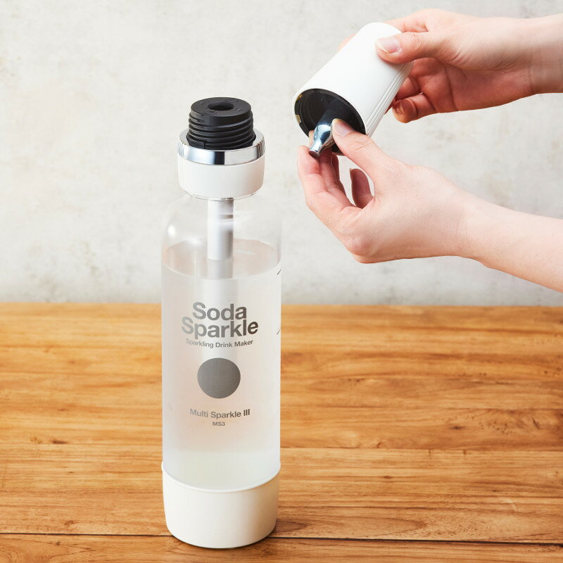 ● ここがポイント ● ○いつでもどこでも簡単に炭酸飲料を楽しめる「ソーダスパークル」は、「ひねって」「振って」「注ぐ」だけで炭酸水が手軽に作れます。 ○ジュースもワインも炭酸に!お水ならたっぷり1リットル、ジュースやワインなどの場合は650mlの炭酸飲料を作ることができます。 ○水は炭酸水に、フルーツジュースは炭酸ジュースに、白ワインはスパークリングワインに。割って薄めることなく、本来の濃度そのままのスパークリングドリンクが作れます。 ○飲む以外の用途でも活躍。ヘアサロンのような心地よい炭酸シャンプーや、炭酸洗顔、炭酸水パックなど、ご自宅での炭酸美容にも効果的です。 ○炭酸水は、キッチンの油汚れやガラスの拭き掃除にも効果的です。 ○料理家監修のレシピブック付き。炭酸水を使ったおいしい料理に気軽に挑戦でき、アレンジも広がります。 ○小さなカートリッジから炭酸水が作れるので、これまでのようにペットボトルで買い込んだりする必要がありません。ペットボトルのゴミも減らせるので環境への配慮にもつながります。 ○使用後はスチールごみとして捨てられる便利なカートリッジ式。カートリッジをストックしておけば、飲みたいときにすぐ作れます。 ○ガスカートリッジは不燃性ガスなので安全。1回ごとに使い切りのスチールカートリッジで、使用後は不燃物で捨てることができます。 ○付属の専用キャップを取り付ければ、他の容器に移し替える手間なく保存が可能。スリムなサイズ感で冷蔵庫の場所も取りません。 ○電源不要で経済的。コンパクトだから持ち運びも簡単です。 ○ボトルは耐久性があり、人体に影響する可能性が指摘されているBPAを含まない安全な素材なので、お子様のいるご家庭でも安心してご使用頂けます。 ○ボトルのみ食器洗い乾燥機OKで片付けもラクラクです。ボトルの内部は熱湯消毒もできるので、常に清潔にご使用頂けます。 ○インドア・アウトドア問わず、様々なシーンを盛り上げてくれるアイテムです。 ○取り換え用専用カートリッジはこちらからご購入頂けます。 型番 MS3-WH・MS3-BL・MS3-PK カラー ホワイト・ブルー・ピンク 本体サイズ ボトル(チャージユニット+ノズルキャップ装着時):(約) φ8.6×H38.5cm、重さ(約)436g専用キャップ装着時:(約)φ8.6×H29cm、重さ(約)220g専用キャップ:(約)幅6.9×奥行6×高さ3.8cmボトル開口部:(約)内径4cmガスカートリッジ1本あたり:(約)φ1.8×H6.6cm 重量 約436g (ボトル+チャージユニット) 容量 水:1Lジュースや白ワイン:650ml 耐熱・耐冷 ボトル:耐熱100℃ / 耐冷1℃ボトル以外:耐熱50℃ / 耐冷1℃ 素材 ノズルキャップ:ABS、ナイロン+グラスファイバー、アルミニウム、ステンレス、真鍮、ポリアセタールボトル:ポリエチレンテレフタレート、ABS専用キャップ:ABS、シリコンチャージャーユニット:ABS、ナイロン+ブラスファイバー、ポリアセタールガスカートリッジ:スチール セット内容 ボトル×1、専用キャップ×1、チャージユニット×1、ノズルユニット×1、ガスカートリッジ×5 食器洗い乾燥機 ボトルのみ使用可能 ※ 注意事項 ※※使用前のガスカートリッジには液化炭酸ガス(二酸化炭素を液体化したもの)が入っています。1回使い切りタイプです。 ※ガスカートリッジに付属している取扱説明書、安全上のご注意を必ずお読み下さい。ガスカートリッジはスチール製です。ご使用後のガスカートリッジは、空(穴があいている)であることを確認の上、お住まいの地域の自治体で定められた条例に従って処分して下さい。 おしゃれ オシャレ お洒落 人気 SodaSparkle ソーダスパークル マルチスパークル 炭酸水 炭酸飲料 炭酸ドリンク 炭酸ジュース 果実炭酸 家庭用炭酸水 自家製炭酸水 ソーダマシン ソーダメーカー 炭酸水メーカー ソーダスパークルのある生活 炭酸水のある生活 繰り返し使える サステナビリティ sustainability 持続可能性 サステナブル ゴミ削減 健康生活 健康 美容 ダイエット 疲労回復 血行改善 炭酸水ダイエット 炭酸水洗顔 炭酸洗顔 炭酸パック 炭酸美容 宅飲み 家飲み おうちバー おうち呑み 炭酸水割り ソーダ割りハイボール スパークリング アウトドア パーティー 景品 新生活 1人暮らし 一人暮らし ひとり暮らし 2人暮し 二人暮し ふたり暮らし 老後暮らし 高齢者暮らし テレワーク 在宅勤務 リモートワーク 在宅ワーク テレワーク おすすめ オススメ プレゼント ギフト 贈り物 誕生日プレゼント クリスマスプレゼント 新築祝い 引越し祝い 就職祝い 結婚祝い 母の日 父の日 敬老の日 勤労感謝の日 ホワイト SodaSparkle Multi MS2-1 後継モデル 4954319120101 MS3-WH ブルー 4954319120118 MS3-BL ピンク 4954319120125 MS3-PK 別売り カートリッジ 4954319120132 MS3-24 ガスカートリッジスタンド 4954319120200 MSK-WH 4954319120217 MSK-GRG