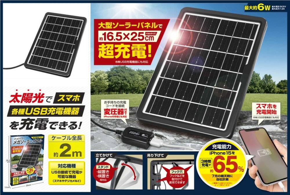 ハック HAC ハイパワーメガソーラーパネル HAC3615 ブラック 商 品 説 明 大型ソーラーパネルで超充電!太陽光でスマホ、各種USB充電機器を充電できる! 大型ソーラーパネルで超充電!パネルサイズ約16.5×25cm ■充電能力iPhone13(充電残量50%時)を1時間充電で約31%10月後半の晴天時(気温約20時)自社計測※機種や太陽光の状況によって異なります ■対応機種USB接続で充電が可能な機器(スマホやデジカメなど) お手持ちの充電コードを接続変圧器付きでiPhoneの充電にも対応 ●立てかけてスタンド縦置き、横置き両対応 ●フック穴フックなどを取付けて使用できます ※新仕様変更に伴い、旧仕様のお届けとなる場合がございます。(パッケージの一部デザイン、ケーブル全長:(旧)2.5m→(新)2m)※一部の仕様やデザインは予告なく変更になる場合がございます。 商 品 仕 様 サイズ 本体:約W19×D2.5×H28cm、パネル:約16.5×25cm ケーブル全長 約2m 重さ 約623g(本体) 素材 ABS、ガラス 電源 AC100V50/60Hz 最大電圧 DC5V 最大出力 1.2A 保 証 に つ い て この商品には、メーカー保証がございません。 初期不良品の場合のみ、商品到着から1週間以内であれば弊社で対応いたしますので、ご連絡ください。 注 意 事 項 ●こちらの商品は、新品です。●モニター環境により、実際のカラーと異なって見える場合がございます。 ★この商品は発送先が北海道、沖縄、離島の場合は注文金額により以下の送料が必要です。・北海道の場合、注文金額が3,980円未満は880円、3,980円以上は送料無料です。・沖縄、離島の場合、注文金額が9,800円未満は880円、9,800円以上は送料無料です。
