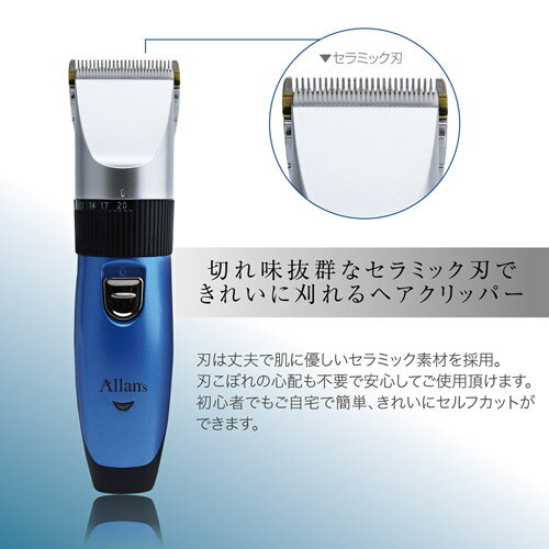 切れ味抜群なセラミック刃できれいに刈れるヘアクリッパー アタッチメント4種、充電池2個付属●寸法:約W4.5×D4×H17.5cm ●重量:約175g ●材質:ABS PP ●電源方式:充電式(専用アダプタ付属) ●定格容量:4VA ●アダプタ:DC3V 300mA ●材質:ABS PP ●定格電圧:100V ●定格周波数:50/60Hz ●定格消費電力:充電時:1.8W ●内蔵充電池:(充電池1個につき)ニカド電池 600mA 1.2V 2本 ●充電時作動時間:約8時間充電(満充電)で約45分作動(無負荷時)備考※メーカー取り寄せ商品となりますので、ご注文後の注文キャンセルはお承りできません。※メーカー取り寄せ商品となりますので、返品交換は一切お受けいたしかねます。ただし初期不良の場合でメーカーに在庫が確認できる場合は交換にて対応致します。※商品開梱後は組み立てやご使用の前に、コンディション・付属品類が揃っていることをご確認ください。 お客様の都合による返品・交換はお受けできませんので、ご注意ください。※メーカー取り寄せ商品となりますので、メーカー欠品の場合はご注文をキャンセルさせていただきます。あらかじめご了承ください。