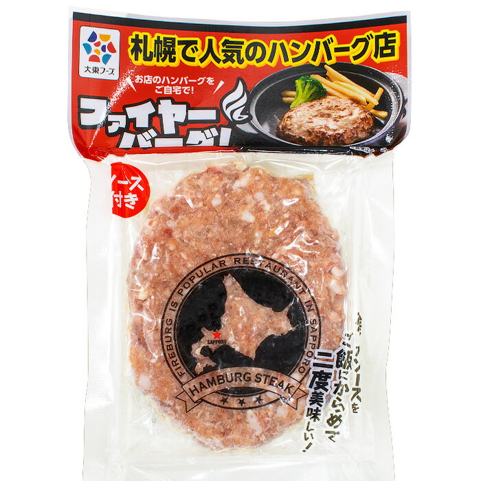 商品名ファイヤーバーグ(タレ付) 商品説明札幌の人気店ファイヤーバーグの手作りハンバーグをお自宅で!この道40年のハンバーグ職人が作るハンバーグは、毎日、新鮮な挽き立ての牛肉と豚肉を黄金比で配合、ふっくら・あふれる肉汁が飛び出す、こだわりの手作りハンバーグです。ハンバーグには店舗でも使用している、オリジナルハンバーグソースも付いているので、お店の味をご自宅でもお楽しみいただけます! パッケージサイズ 265mm×165mm×20mm重さ:179g お届け日通常ご注文またはご入金の確認から2~6営業日のお届けとなります。 発送温度帯冷凍発送 ※配送温度帯の違う商品を一緒にご注文頂いた場合、別送となり追加送料が必要となります。包装・のし 商品の性質上、包装・のしのご要望はお受けできませんのでご注意ください。 名称 冷凍ハンバーグ 原材料名 ハンバーグ:食肉(豚肉(輸入、国産)、牛肉(輸入、国産))、つなぎ(調整乳、パン粉、卵、食塩)、玉ねぎ、豚脂、牛脂、砂糖、こいくち齧油(本醸造)、香辛料/調味料(アミノ酸等)、pH調整剤、イーストフード、ビタミンC、(一部に卵・乳成分・小麦・牛肉・大豆・豚肉を含む)ソース:しようゆ加工品(国内製造)、砂糖、豚肉、青ねぎ、おろし生姜、おろしにんにく、食塩、酵母エキス、香辛料、ローレルバウダー/カラメル色素、調味料(アミノ酸等)、酸味料、(部に小麦・大豆・豚肉を含む)栄養成分表示100g当たり(推定値) エネルギー:231kcalタンパク質:11.0g脂質:16.0g炭水化物:8.0g食塩相当量:1.6gアレルギー品目一部に卵・乳成分・小麦・牛肉・大豆・豚肉を含む 内容量 165g(ハンバーグ150g/別添ソース15g)賞味期限製造日より300日保存方法冷凍(-18度以下)販売者株式会社 大東エンタープライズ北海道札幌市中央区北2条西13丁目1-1 K2ビル1F(本社) 季節の行事・イベントお中元ギフト / 御中元 / お盆 / 残暑見舞い / 暑中見舞い / お礼 / 敬老の日 / ハロウィン / クリスマス / 冬ギフト / お歳暮 / 御歳暮 / 年越し / 年末年始 / お正月準備 / ご挨拶 / お年賀 / 御年賀 / お正月 / お返し / ひなまつり / 新生活 / 母の日 / こどもの日 / 父の日 贈り物・ギフト・その他贈答品 / お土産 / 手土産 / 御祝 / 御礼 / お返し / 内祝い / 引き出物 / お祝い / 結婚祝い / 結婚内祝い / 出産祝い / 出産内祝い / 引き菓子 / 快気祝い / 快気内祝い / 初節句 / 七五三 / 入園 / 進学祝い / 進学内祝い / 入学内祝い / 入学祝い / 誕生日祝い / プレゼント / ギフト / プチギフト / 北海道限定 / 北海道お土産 / 北海道土産/ ポイント消化 / ポイント消費 / わけあり / 訳あり / お取り寄せ / 詰め合わせ / 通販 / 就職 / 昇進 / 退職祝い / 引越し / 開店祝い / お見舞い / 記念日 / 子供 / 長寿 / 仏事 / 新築 / 弔事 【商品代金15,000円(税込)以上は、1梱包送料無料】 ※配送温度帯の違う商品を一緒にご注文頂いた場合、別送となり追加送料が必要となる場合がございます。(常温と冷凍等) ※沖縄は「商品代金15,000円以上送料無料」「送料無料」「送料込み」いずれも送料無料とはならず、別途送料が発生いたします。 ※ご注意 > 必ずお読み下さい 画像はイメージです。メーカーの都合等により、実際にお届けする商品とパッケージ・デザイン等につきましては、予告無しに変更される場合がございます。予めご了承くださいませ。【賞味期限について】SDGsにおけるフードロス削減のため、同じ商品を複数購入いただいた場合でも賞味期限が違う場合がございます。小分け袋有料化につき、ご入用の方は別途ご注文頂きますようお願い申し上げます。ご注文はこちらから