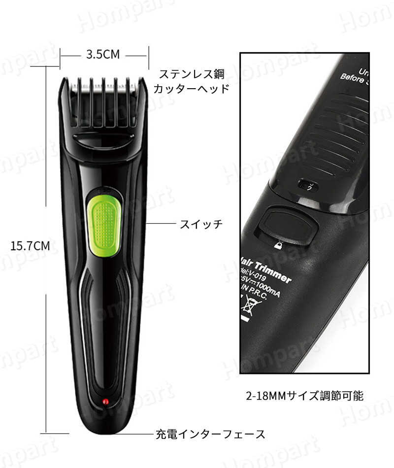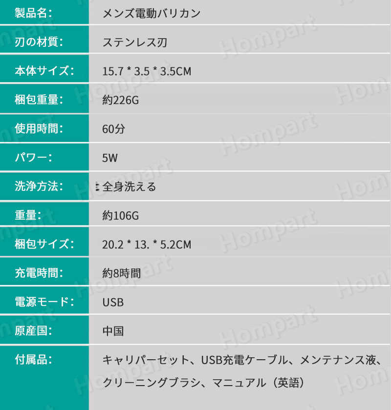 製品名:メンズ電動バリカン 刃の材質:ステンレス刃 本体サイズ:15.7 * 3.5 * 3.5CM 梱包重量:約226g 使用時間:60分 電力:5W 洗浄方法:全身洗える 重量:約106g 梱包サイズ:20.2 * 13. * 5.2cm 充電時間:約8時間 電源モード:usb 原産国:中国 付属品:キャリパーセット、USB充電ケーブル、メンテナンス液、クリーニングブラシ、マニュアル(英語)