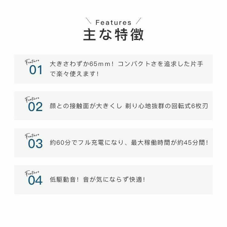 基本仕様本体サイズ 46mm * 65mm使用可能時間 45分間刃の枚数 6枚刃充電時間 60~120分間消費電力 約3W使用電池 充電池カラーバリエーションブラック シルバー グリーン グラデーション手のひらのコンパクトサイズ重くてかさばるシェーバーを持ち歩きたくないあなたのために設計されました。きさは玉子とほぼ同じで、ポケットやいつものバッグに入れて楽々持ち運べます。高級感溢れるデザイン高級感のあるメタリックカラーを採用することにより、優れたデザインと耐久性を両立しています。顔の凹凸にしっかり密着ソフトなスチール製カバーは、顔の輪郭やあごを繊細に削り取ります肌あたりがやさしい回転刃摩耗に強く剃り味が長持ちする、ステンレス刃物鋼を外刃に採用しています