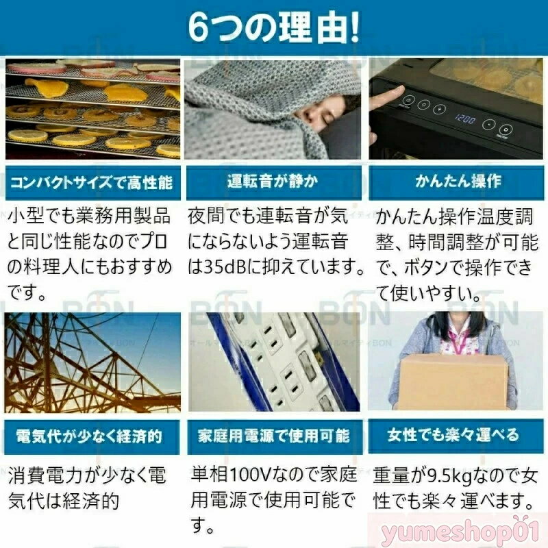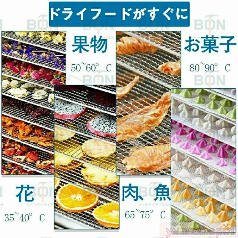 商品情報 【タッチパネル式】 タッチパネル式温度作業時間簡単に設定できます。**静音性重視の方におすすめの食品乾燥機、高床式のデザインで、テーブルと接する部分を抑えられていますので、振動が伝わりにくいです。音仕様のモーターを採用し、作動音は約45-50dB、夜間運転でも静かです。 【管理栄養士推奨】 食品から水分を蒸発させることで細菌カビからの腐敗を防ぎ常温でも長期間の保存が可能になりさらに水分が飛ぶことでエネルギーやうまみが凝縮されます。フードドライヤーと天日干しを取り入れれば栄養価の増加が期待できるものもあり子どもやペットのための無添加な」おやつ作りにびったりです。ドライ(乾燥食品)を自分で作るとなると大変で中々作る機会はないと思いますがフードドライヤーがあれば簡単に誰でも作ることが出来るので栄養面やフードロスを気にする方には」最適な商品だと思います。 【フルーツドライヤーが必要の理由】 食品脱水機を使用して、味と食感を保持しながら、果物、野菜、キノコ、草薬、肉、魚などの様々な食物のミネラルとビタミンを簡単にロックすることができます。乾燥された食物は、より長い期間保存することができます。果物が食べきれない場合は、このフルーツドライヤーはあなたの最適な選択です。また、ペットにおいしいジャーキーを作るにも最適です。 【より均一な乾燥と360度熱風循環】 弊社のフルーツドライヤーはプラスチック制フルーツドライヤーと異なり、ファンは底面ではなく背面に配置されているため、各層の食材はより均等に乾燥されます。背面ファン1個付き、360度循環の熱風で全トレイをしっかり加熱します。30-90℃の低温高温乾燥に対応しています。干し野菜やドライフルーツ、ジャーキー、干し芋、ヨーグルト作りなど様々な食品の乾燥を行うことができます。 【安心安全なステンレス鋼素材】 この食品乾燥機は食品グレード304ステンレス鋼で作れられ、耐熱、錆止め、洗い易い。何時間加熱にしても劣化しないし有害物質も出ません、もっと安全安心。プラスチック製フルーツドライヤーに比べて、ステンレス製の方が洗浄しやすいだけでなく、寿命も長いです。