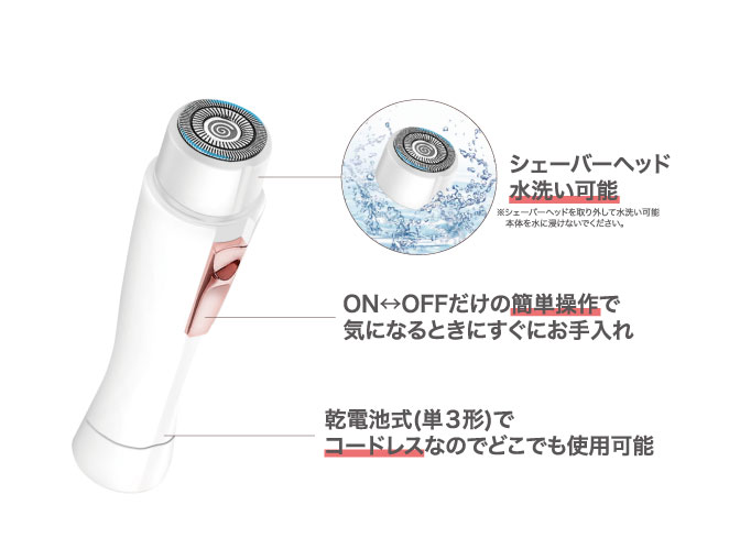 いつでもどこでもうぶ毛ケア。 急なお出かけやお泊まり前に。気づいた時にさっと処理。 顔のうぶ毛から、ビキニラインまでお使いいただけます。 刃がお肌に直接触れないのでヒリヒリしにくい! 剃りにくい毛もしっかり取り込み回転刃でスムーズにカット。 シェーバーヘッドは取り外して水洗いが可能。 ON-OFFだけの簡単操作・乾電池式でコードレス 。 ■使用電池:単3形アルカリ乾電池×1本(別売) ■メーカー:リエモ株式会社