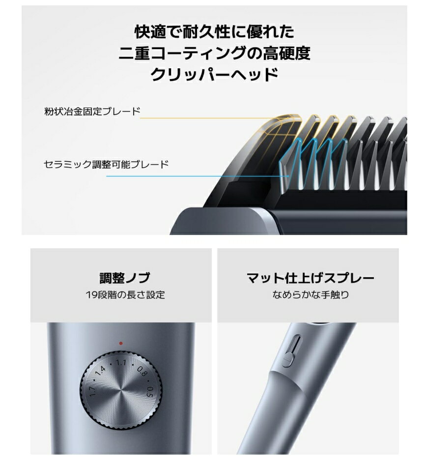 色 グレー 商品の重量 266 グラム ブランド xiaomi(シャオミ) 特徴 USB充電 商品寸法 (長さx幅x高さ) 19.5 x 5.7 x 19.8 cm この商品について 【高硬度クリッパーヘッド】固定ブレードは粉末冶金技術を用い、真空DLCコーティングとグラフェンの二重コーティングを施すことで耐久性を高めています。これにより、摩擦による熱の発生を抑え、頭皮への不快感を軽減します。 【14段階の長さ調整で、思い通りのヘアスタイルを実現】丸刈り:0.5〜1.7mmで微調整、スポーツ刈り:2〜14mm(調整可能トリミングコーム使用)、長いヘアースタイル:16〜28mm(調整可能トリミングコーム使用)。 【パワフル&やさしいスピード設定で、ご家族みんなにおすすめ】ジェントルモード (低速)は細い毛に適しています。パワフルモード (高速)は太くて硬い髪に適しています。 【詰まり防止スマートシステム】一定の電圧を保つスマートシステムを搭載。スムーズな動作を実現し、カット中の詰まりを軽減します。 【スマートデジタルディスプレイで状態を一目で確認】デジタルディスプレイでクリッパーの状態をいつでも確認可能。 【USBとType-C両対応の充電方式で、さまざまな充電機器に対応】多様な充電方法に対応。コンセントやパソコン、車のUSBポートなど、さまざまな充電機器に接続可能です。充電しながらすぐに使えるので、いつでもどこでも手軽にトリミングができます。 商品画像は、ご使用のモニタ端末などによって、色合い、質感などが実際のものと多少異なって見える場合があります。 ご注文およびご入金のタイミングにより、稀に在庫欠品となる場合がございます。 欠品の場合は、ご注文をキャンセルさせて頂きます。何卒こ了承くたさい。 複数ご購入頂いた場合は、発送方法が変更になる場合がございます。 住所に不備があるとお届けできません。送付先不明による商品引き戻し、再発送の際の費用は、 お客様の負担となります。 ご不便をおかけいたしますが、何卒ご了承いただきますようお願い申し上げます。関連商品体重計 bluetooth スマホ連動 green, ad26-712...Ulike メンズ脱毛器 Air2 ブラック【訳あり】充電式熱中警戒アラートバンド HTK-2948 猛暑から身...3,580円55,100円3,500円オムロン 体重 体組成計 カラダスキャン ブラウン HBF-214-B...【訳あり】パイモア CHROMATO カラーシャンプー Macchia...【訳あり】ポケモンセンターオリジナル もっちりっちぬいぐるみ イルカマ...3,622円3,520円3,582円【訳あり】INTERLOCK(インターロック) ナリッシュ シャンプー...Finish 【まとめ買い】 フィニッシュ 食洗機 洗剤 オールインワ...Gillette ジレット カミソリ 髭剃り ひげそり 深剃り 本体 ...3,580円3,567円4,570円【訳あり】コミネ(KOMINE) バイク用 リマインダーアラームディス...【訳あり】(株)ミヤナガ ミヤナガ デルタゴンSDS φ4.3 5本パ...OFFBAIKU メンズシェーバー【超小型 顔自動感応】電気シェーバー...3,556円3,505円1,880円