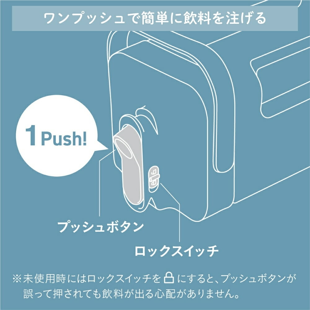 商品名: シービージャパン 冷蔵庫に入れたまま注げるジャグ MEGA TANK ジャグ 3.5L ウォータージャグ 冷蔵庫 キャンプ アウトドア ハンドル付き ロック機能付き -商品説明- 冷蔵庫に入れたまま注げるジャグ MEGA TANK まるでウォーターサーバーのように、いつでも楽に冷たい飲料が飲めるジャグ『冷蔵庫に入れたまま注げるジャグ MEGA TANK』。 冷蔵庫から重たいジャグを出し入れしなくても、冷蔵庫に入れたままワンプッシュで 飲料を注げるので楽々です。 ハンドル付きなのでアウトドアシーンなどでの持ち運びにも便利。 プッシュボタンを押しながらロックすれば、注ぎ口が開いた状態で固定されるので そのまま飲料を注げて、ロックを解除するとワンプッシュで簡単に飲料を注げます。 プッシュボタンが固定される便利なロック機能付き プッシュボタンを押さなくても飲料が出続ける。 プッシュボタンを押してるときだけ飲料が出る。 プッシュボタンを押しながらロックすると、プッシュボタンが固定されて押さなくても飲料が出続けます。 本体を持って飲料を注ぎたいときに便利。 ロックを解除した場合、プッシュボタンを押したときだけ飲料が出ます。 プッシュボタンを離すと飲料が止まります。 ※使用しないときはプッシュボタンを押さないでロックすれば、ボタンを押すことが出来なくなり、飲料が出てきません。 横持ちでも注ぎやすい設計 本体にへこみがあり横持ちしやすい設計。 フタの内側には、氷やティーバッグが出るのを防ぐフィルターが付いています。 アウトドアでもおすすめ ハンドル付きなのでキャンプやBBQなどに気軽に持ち出すことが出来ます。 実容量3.5Lと大容量なので、家族や友人たちで集まる場所に置いておけば各々自由に飲料を飲めて便利です。 -特徴・品質- ・冷蔵庫に入れたまま使えるワンプッシュ注ぎ口。 ・3.5Lの大容量でも軽量(355g)設計で扱いやすい。 ・ロック機能付きプッシュボタンで使い分け自由。 ・氷やティーバッグが出ないフィルター付きフタ。 ・持ち運びに便利なハンドル付きでアウトドアにも最適。 -仕様- ・メーカー:シービージャパン ・商品名:冷蔵庫に入れたまま注げるジャグ MEGA TANK ・サイズ: ハンドル使用時:W140×D130×H342mm ハンドル未使用時:W140×D153×H300mm ・重量:355g ・容量: 満水容量:3.7L 実容量:3.5L ・耐熱温度:80℃ ・耐冷温度:-20℃ ・耐荷重:3.7kg ・材質: [フタ・ハンドル]ポリプロピレン [プッシュボタン・ロックスイッチ]ABS樹脂 [パッキン]シリコーンゴム ・原産国:中国 ・カラー/JANコード: ホワイト:4573306873532 グレー:4573306873549 -機能- ・ロック機能付きのプッシュボタンで注ぎ方を選べる。 ・氷止めフィルター付きで中身がきれいに注げる。 ・アウトドア、BBQ、キャンプ、非常時の水分確保にもおすすめ。 ・冷蔵庫ドアポケットにすっきり収まり、省スペース。 ・使わないときはロックで誤操作を防止。 -使用・手入れについて- ・使用前後は中性洗剤と柔らかいスポンジで洗浄してください。 ・食洗機は対応しておりません。 ・高温の液体を長時間入れないようにご注意ください。 ・横倒しでの保管は漏れの原因となりますのでお避けください。 -注意事項- ・商品の色はできる限り実物に近づけていますが、ディスプレイ設定や撮影条件により色味が異なる場合があります。ご了承ください。 ・ご注文のタイミングや内容により、購入後のキャンセルや修正が制限される場合があります。 ・同時に複数のご注文があった場合、システム上の遅延により在庫がないにも関わらず購入できてしまう場合があります。そのような場合は速やかにメールでお知らせいたします。商品概要商品名: シービージャパン 冷蔵庫に入れたまま注げるジャグ MEGA TANK ジャグ 3.5L ウォータージャグ 冷蔵庫 キャンプ アウトドア ハンドル付き ロック機能付き -商品説明- 冷蔵庫に入れたまま注げるジャグ MEGA TANK まるでウォーターサーバーのように、いつでも楽に冷たい飲料が飲めるジャグ『冷蔵庫に入れたまま注げるジャグ MEGA TANK』。 冷蔵庫から重たいジャグを出し入れしなくても、冷蔵庫に入れたままワンプッシュで 飲料を注げるので楽々です。 ハンドル付きなのでアウトドアシーンなどでの持ち運びにも便利。 プッシュボタンを押しながらロックすれば、注ぎ口が開いた状態で固定されるので そのまま飲料を注げて、ロックを解除するとワンプッシュで簡単に飲料を注げます。 プッシュボタンが固定される便利なロック機能付き プッシュボタンを押さなくても飲料が出続ける。 プッシュボタンを押してるときだけ飲料が出る。 プッシュボタンを押しながらロックすると、プッシュボタンが固定されて押さなくても飲料が出続けます。 本体を持って飲料を注ぎたいときに便利。 ロックを解除した場合、プッシュボタンを押したときだけ飲料が出ます。 プッシュボタンを離すと飲料が止まります。 ※使用しないときはプッシュボタンを押さないでロックすれば、ボタンを押すこ
