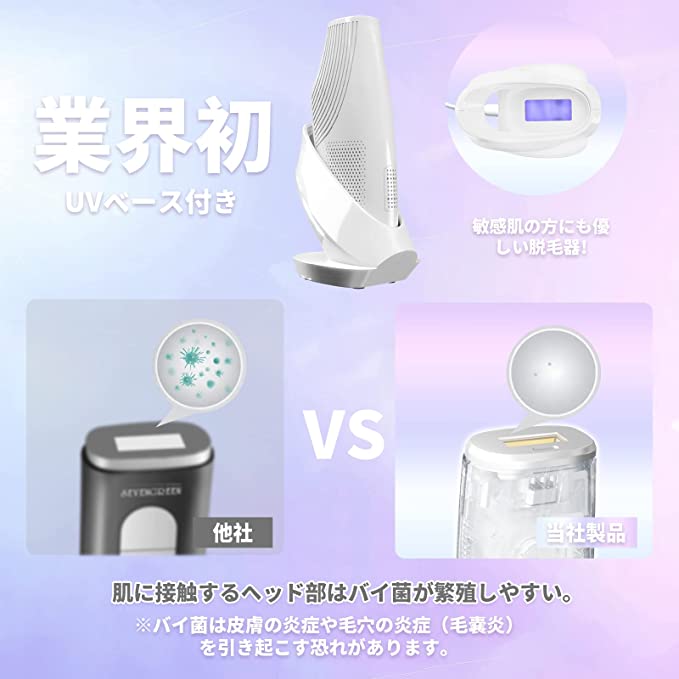 【最大18.0Jハイパワー&先端冷却技術】最短4週間でサロンとほぼ同じ効果が出ます。従来のIPL技術より強いサファイア冷感無痛脱毛技術を採用して、脱毛部位の表皮温度は瞬時に10℃まで下がります、快適感を高め、痛みを伴わずに脱毛しやすくなりました。敏感な部分でさえ、完全に無痛で脱毛をすることできます。 【UVベース付き】オートクリーンシステムを搭載。脱毛後、付属のUVベースにセットするだけで、照射面をクリーンにできます。使用中の肌の敏感さや刺激を抑え、使用部位の赤みやアレルギーを防ぐことができます。 ※長く製品をご使用頂くため、サファイアと機器を短時間で冷却できますよう、電源を切ってもファンが10秒ぐらい回り続けます。故障ではありませんのでご安心ください。 【平面サファイアヘッド】プロが脱毛サロンで使用している平面デザインのサファイアヘッドを採用。透過距離が短く屈折損失率が極めて低い、脱毛効果はより高いです。5段階までのエネルギー強度、照射される光のうち無効な波長の光を99%遮断して、精確にムダ毛の再生を抑制します。 【肌色検知センサー&LEDディスプレイ】自動的に肌の色を検知し、誤照射を防ぐことができます。脱毛器の照射レベルは5段階調節。カラーチャートを参照に、ご自分の肌色に合う照射レベルで使う事でより快適な脱毛体験可能です。液晶画面で残りのフラッシュ回数が一目でわかります。 【自動/手動2つモード& 】手動と自動の2つのモードがあります。 手動モードは唇、指、脇の下、ビキニラインなどの狭い所に適しています。自動モードは、腕、足、腹部、背中などの広い所に適しています。 ほぼ全身に使える家庭用光美容器です。