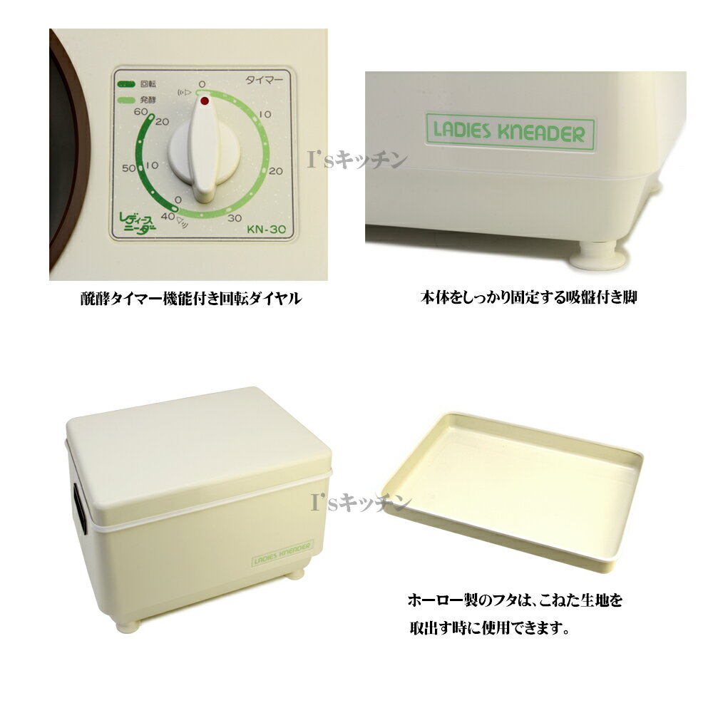 まぜる・こねる スイッチひとつのパンこね器の定番。 発酵用ヒーターは、内蔵してません。(余熱醗酵のみ) W37×D27×H24cm 約8.5kg パン・もち兼用ハネ付 電源:100V/50-60Hz 消費電力:120〜125W 醗酵タイマー付(スイッチ兼用60分タイマー・チャイム付) 日本製 1年保証 ※家庭向け製品につき、業務使用には適しておりません。業務使用された際の1年保証は対象外となりますのでご了承ください。 パン(小麦粉):300〜600g うどん(小麦粉):300〜400g ■返品・交換不可 商品初期不良、輸送時の破損以外での返品、交換は原則お断りしております。 ご注文間違えにご注意ください。 【ご注意】 商品は、商品箱をエアパッキンで梱包してその上に送り状を貼って発送いたします。 お届け後にお客様の元で開封、製品箱に貼付されている保証書を剥がした場合にはお客様都合での返品、交換につきましてはいかなる場合でも対応いたしませんのでご了承ください。専門店だからできるこの価格!!激安 本格パンこね機 パンつくりは生地がきめてです。 レディースミキサー・ニーダーの使い方。 1:正確に計量した材料を、15〜20分、仕込水でこねあげます。 力も時間も全ておまかせ! 2:そのまま30〜40分置いて一次発酵。 3:羽を数秒回転させて、一次発酵した生地からガス抜きをします。 パン教室などで愛用されている、パン作りの基本のパン捏ね器です。いろいろパンこね機はあるけれど、レディースミキサー・ニーダーはやはりそのパワーがちがいます。だからこそ、長い間パン教室などで愛用されてきました。 商品名 型番 パン (小麦粉) うどん (小麦粉) 餅 卵 醗酵 付属品 定格 消費 電力 重量 小 麦 粉 は 同 容 量 レディース ニーダー KN-30 300〜 600g 300〜 400g 800g まで ※1 - 余熱利用で 一時発酵 ※2 フッソ樹脂加工ポット 樹脂製羽根 (パン、餅の2種類付) 中フタ付 レシピ付 125W 8.5kg 「まぜる・こねる・たたく」から「発酵・ガス抜き」までスイッチひとつでOK レディース ミキサー KN-200 300〜 600g 300〜 400g 約1kg 3〜 6個 余熱利用で 一時発酵 ※2 フッソ樹脂加工ポット 樹脂製羽根 (パン、餅、 クリーム用の3種付) 中フタ付 レシピ付 127〜 160W 10.7kg パン生地作りはもちろん、玉子やクリームの泡立てなどケーキ作りにも威力を発揮します。 レディースミキサー KN-200 のみ高速・低速回転の切替スイッチ付 大 型 Lニーダー KN-1000 400〜 1kg 400〜 600g 約1〜 1.5kg - 余熱利用で 一時発酵 ※2 フッソ樹脂加工ポット 樹脂製羽根 (パンと餅兼用1個付) 中フタ付 レシピ付 130W 9.5kg KN-30と同機能で大型タイプ。 ※1 (ポット容量はKN-200と同じだがモーターの力は200よりも弱い) ※2(発酵用のヒーターは内蔵していません。余熱発酵です。) 回転が鈍くなったら、ポットボスが原因の事がほとんどです。交換部品販売しております。 部品交換を行い、10年以上継続して使用されている方が多くいらっしゃいます。 クイジナートなどパン生地も出来るフードプロセッサーはパン生地作成が「速い」ため、 こね時間などの調整がうまく行かず出来上がりに差が出るケースが有ります。 そのため、安定した出来上がりにはニーダーをおすすめしております。