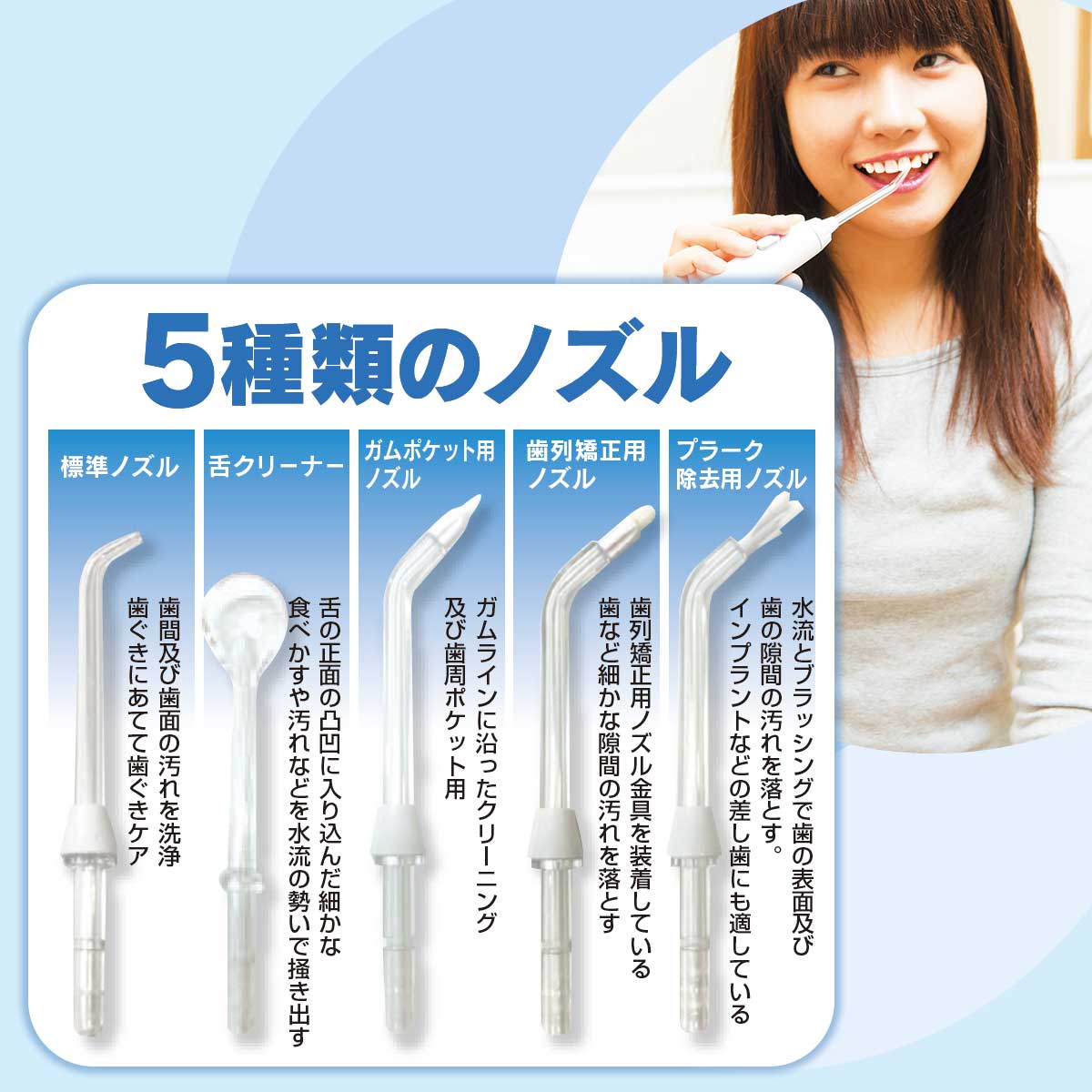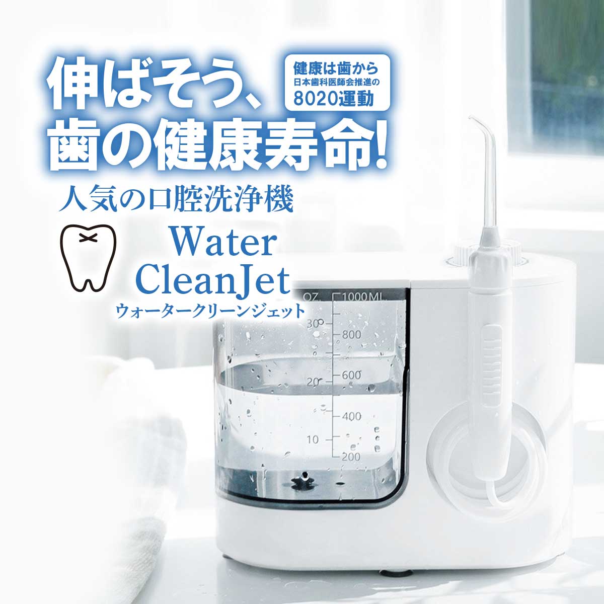 毎分1,800回の脈動ジェット水流で歯茎や歯周ポケットなどを協力洗浄!! 強烈なジェット水流を放射する口腔洗浄器。この水圧の力によって、歯ブラシでは届きにくい歯・歯茎の隅々の汚れを除去します。歯垢はもちろん、食べカスも綺麗に除去。口腔内が清潔な状態になることで、歯周病や歯肉炎予防につながります。 あらゆる口腔ケアが出来るように、用途別の5種類のノズルが、歯や歯茎周辺の洗浄と、さらに細かな隙間の汚れや舌にある食べカスや汚れなど口腔全体を洗浄することが出来ます。毎日の口腔ケア習慣で、健康的な毎日を送りましょう。 メーカー希望小売価格はメーカーカタログに基づいて掲載しています伸ばそう、歯の健康寿命! 毎分1,800回の脈動ジェット水流で歯間や歯周ポケットなどを強力洗浄!! 強烈なジェット水流を放射する口腔洗浄器。この水圧の力によって、歯ブラシでは届きにくい歯・歯茎の隅々の汚れを除去します。歯垢はもちろん、食べカスも綺麗に除去。口腔内が清潔な状態になることで、歯周病や歯肉炎予防につながります。 あらゆる口腔ケアが出来るように、用途別の5種類のノズルが、歯や歯茎周辺の洗浄と、さらに細かな隙間の汚れや舌にある食べカスや汚れなど口腔全体を洗浄することが出来ます。毎日の口腔ケア習慣で、健康的な毎日を送りましょう。 口腔洗浄機 ウォータークリーンジェット セット内容 本体、標準ノズル×2本、舌クリ-ナ-、 ガムポケット用ノズル、歯列矯正用ノズル、プラ-ク除去ノズル(計5種類6本) ・ACアダプタ-、取扱説明書 サイズ 本体サイズ:(約)幅20.5×高さ18.5×奥行12.5cm 化粧箱サイズ:(約)幅23×高さ20×奥行14.5cm 材質 本体:ABS、 タンク:ポリカーボネイト、 ホーズ:ポリウレタン、 ノズル:ポリウレタン 生産国 中国 特記事項 タンク容量:1000ml、 消費電力:24W、 ホースの長さ:(約)1ⅿ