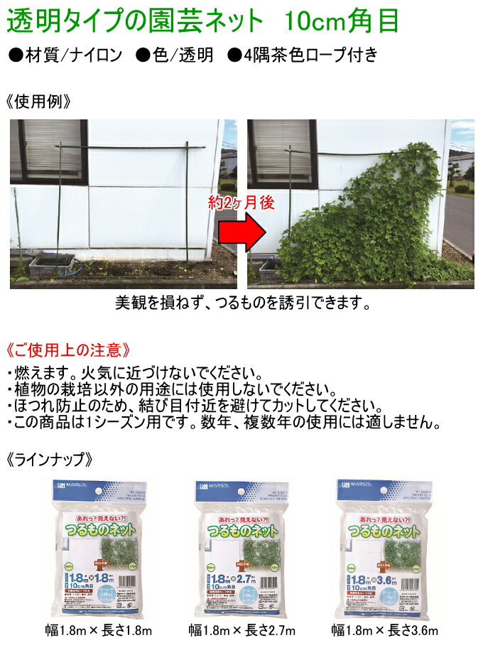 商品詳細 サイズ (約)幅1.8m×長さ2.7m(約10cm角目) 材質 ナイロン 色 透明 使用上の注意 燃える恐れがありますので、火気に近づけないでください。 植物の栽培以外の用途には使用しないでください。 ほつれ防止のため、結び目付近を避けてカットしてください。 この商品は、1シーズン用です。数年、複数年の使用には適しません。 原産国 中国 特徴 美観を損なうことなくつる性植物を栽培できる透明タイプの園芸ネット。 4隅茶色ロープ付き。 窓辺でつる花を育てれば日よけとしても楽しめます。