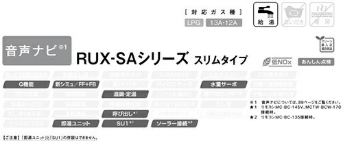 【セット内容】 (1)RUX-SA2016B(A)-E ・給湯器本体 (2)MC-145V(A) ・台所リモコン ※浴室リモコンは別売りです。 【規格・特徴】 ・外形寸法:幅250×奥行225×高さ610mm ・質量:17.5kg ・PS扉内後方排気型 ・20号 ・スリムタイプ ・給湯専用 ・給湯・給水接続15A ・本体カラー:ユーロホワイト ・排気筒口径:φ100 ・排気延長:7m4曲りまで ※別売のφ100排気延長部材が必要です。 ※現在の給湯器よりも小さくなる場合は、別途取り付けアダプターが必要です。 現在の機種によりアダプターは異なりますので、お問い合わせください。 ※メーカー保証は2年です。 「あんしんの3年保証」 通常1年または2年のメーカー保証期間が3年になります。お申し込み方法は商品の説明書に同封の申し込みはがきに必要事項をご記入の上お申し込みください。 ※お申し込みいただいたお客様のみが対象となります。 ※業務用としてお使いの場合は対象外となります。 【別売部材】 ・浴室リモコン(オートストップ対応) BC-145V(A) ・台所リモコン(オートストップ対応) MC-145V(A) ・浴室リモコン(オートストップ非対応) BC-135(A) ・台所リモコン(オートストップ非対応) MC-135(A) ・2芯ケーブル UC-25-10A ・2芯コネクタ付ケーブル UC-25C-10A ・配管カバー WOP-L101(K)UW ・扉内設置用取付BOX(PS金枠550) UOP-5030-1 ・扉内設置用取付BOX(PS金枠340) UOP-5030-2 ・扉内設置用取付BOX(PS金枠2連用) UOP-5030-3 ※他にφ100排気延長部材は別売です。 【商品説明】 キッチン、洗面所、シャワーとお湯が必要な箇所で給湯できます。もちろん、浴槽にお湯を貯められます。 しかし、給湯器はお湯をつくる機能だけなので、おいだきはできません。 オートストップ対応リモコンとセットになります。 ふろ温度と湯量を設定すれば、いつでもピッとスイッチオンして、自動湯はりします。お湯はりが終わると自動的にお湯をストップして音声でお知らせします。 【注意】 ※現在の給湯器よりも小さくなる場合は、別途取り付けアダプターが必要です。 現在の機種によりアダプターは異なりますので、お問い合わせください。 【大型商品の配送について】 ■基本ドライバー1人で訪問の為、荷下ろしの際にお手伝いできる方が必要となります。 ■大型トラック(4t車)にて配送となります。 道幅6m(一般的な軽自動車がすれ違える道幅)以下の場合、配達ができません。 ※別途追加料金が発生いたしますが、2tトラックでの手配が可能です。 階段、狭所など困難な場合はご相談ください。 ■時間指定が出来かねます。 その為、必ず連絡が取れる電話番号と荷受人の名前を記載ください。 当日の配送時間(目安)については、配送前にドライバーよりご連絡させて頂きます。 Rinnai リンナイ給湯器 RUX-SAシリーズ スリム 非エコ φ100 2023年7月発売 オートストップ対応リンナイRUX-SA2016B-A-E-set