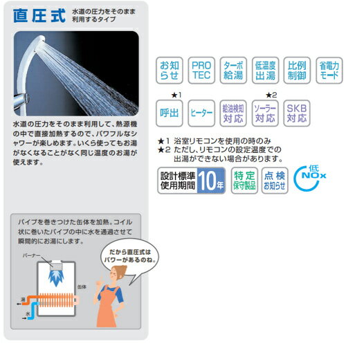 【セット内容】 (1)OQB-4706F ・本体 ・台所リモコン(RC-7626M(T) 本体脱着式) 台所リモコンは本体脱着式。台所リモコンを取り外して使用する場合は別途リモコンコードが必要です。 ※φ106排気トップは入付です。 【規格・特徴】 ・本体寸法:H790×W270×D575mm ・屋内/屋外兼用形 ・水道直圧式 ・4万キロ ・給湯46.5kW ・給湯専用 ・標準 ・強制排気(FE) ・オートストップなし(お知らせあり) ・排気筒径:φ106 ・排気延長:7m3曲がり以内 【別売り部材】 ・浴室リモコンRC-7606S 0702150 ・リモコンコードS 8A(2心) 0700075 ・リモコンコードM 8A(2心) 0700166※本体から台所リモコンを取り外して使用する場合に必要 ・サブリモコン(非防水形) RC-8001A ・浴室サブリモコン(防水形) RC-8001B ・オイルタンクFT-92S 0500672 ・オイルタンクFT-201S 0506105 ・浴室用屋外カバーセット 0700757 ・屋外用排気トップY-90A 0501531※屋外設置時必要 ・送油管φ8セット3M 0501168※屋外設置時必要 【屋外設置する場合について】 ・排気トップは「屋外排気トップY-90A 0501531(別売)」を使用します。 ・送油管は別途必要となりますので、「送油管φ8セット3M 0501168」をご用意ください。 ・台所リモコンを本体から取り外し、本体の操作部穴を入付品の「操作部カバー」で覆ってください。 【注意】 ※サーモ付き混合栓を使ってお湯はりを行う場合は、台所(浴室)リモコンでお湯はりの適温・適量設定をしたあと 水栓側の温度設定を最も高温にしてください。(水栓の種類によっては適温・適量にならない場合があります) 「お湯はり」終了後は、必ず水栓側の温度設定を元に戻してください。 【長期使用製品安全点検制度について】 長期使用製品安全点検制度とは、長期間の使用に伴い生ずる劣化(経年劣化)により安全上支障が生じ、 一般消費者の生命又は身体に対して特に重大な危害を及ぼすおそれが多い「特定保守製品」について、 所有者の登録や有償での点検等を支援する制度として平成21年4月よりスタートしたものです。 商品に同梱の所有者表に、ご記入の上メーカーへご返送いただくか、インターネットより、所有者情報のご登録をお願いいたします。 【大型商品の配送について】 ■基本ドライバー1人で訪問の為、荷下ろしの際にお手伝いできる方が必要となります。 ■時間指定が出来かねます。 詳細の配送状況につきましては、直接運送会社へご確認お願い申し上げます。 不在時は、不在票が投函されますので、お客様にて再配達のお手続きをお願い申し上げます。 2021年4月 NORITZ 給湯器交換祭 標準 給湯専用 オートストップなし お知らせありノーリツOQB-4706F