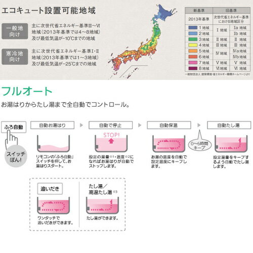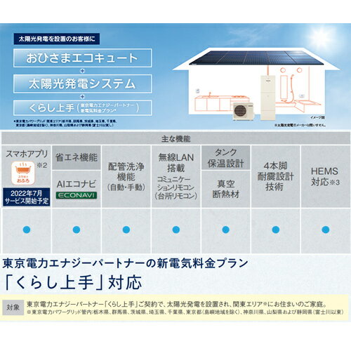 基本工事費(設置接続+処分費)とセットになりました!! お客様の設置状況等により必要部材など発生する場合があります。 まずは、簡単登録の無料お見積もりフォームよりご依頼ください。 また、ご不明な点などご相談承ります。お気軽にお問合わせ下さい。 尚、こちらのセット内容に脚部カバーを含んでおります。 脚部カバーがご不要の場合はお見積り時にお伝えください。 【セット内容】 (1)HE-Y46LQV ・貯湯ユニット ・ヒートポンプユニット (2)AD-HEBD6012A ・上部固定金具セット ※貯湯タンクの転倒防止の為、基本セットに上部固定金具も含みます。 (3)HE-YQWLW ・インターホンリモコンセット(浴室/台所) (4)AD-HEJP4NA-C ・脚部カバー ※部材費など、別途必要となります。 【規格・特徴】 ・460L(4〜7人用) ・屋外設置用 ・角型 ・フルオート ・おひさまエコキュート ・一般地 【別売部材】 ・増設リモコン HE-YQVKZ ・シールド付リモコンコード(2心・10m) AD-HERSA-210 ・ヒートポンプユニット循環配管セット(架橋PE管配管) AD-HHSJ10PA1 ・排水エルボ AD-HHTR13A ・給水側止水栓 AD-HESB67UAA ・無極性ふろアダプターL型 AD-HQJAA-LH ・無極性ふろアダプターS型 AD-HQJAA-SH ・タケノコ継手セット(2ヶ入り) AD-HSSAA-PT3 ・断熱性架橋PE管(t10断熱・10m) AD-HWPEA310 ・アンカーボルトセット(RC床用) AD-HEAB40RA ※別売り部材は一例です。詳しくは当社までお問い合わせください。 【サイズ】 ヒートポンプユニット ・高さ672×幅799(867)×奥行き299(332)mm ・質量/約41kg 貯湯ユニット ・高さ2,170×幅600×奥行き680mm ・質量/約68(満水時528kg) 台所リモコン ・高さ120×幅142×奥行き24.5mm 浴室リモコン ・高さ120×幅196×奥行き24.5mm 【機能】 ・スマホでおふろ(アプリ) ・AIエコナビ ・日射量シフト ・配管洗浄 ・入室サイン ・無線LAN搭載コミュニケーションリモコン(台所リモコン)対応 ・ECHONETLiteAIF認証対応 ・AiSEG対応 ・昼のみ沸き上げ ・真空断熱材 ・4本脚耐震設計技術 ・うっかりアシスト ・給湯ガイド ・キレイキープコート ・自動お湯はり ・自動保温 ・自動たし湯 ・追いだき ・たし湯 ・高温たし湯 【商品説明】 太陽光発電のエネルギーをかしこくつかって、 昼間に沸き上げる「太陽光自家消費促進型 自然冷媒(CO2)ヒートポンプ給湯機 おひさまエコキュート」 大気熱と太陽光発電を利用してお湯を沸かすから、電気消費量が軽減可能な環境性と経済性を両立。 パナソニックエコキュートなら便利な機能がいっぱい、いざという時の生活もしっかりサポート! 【おひさまエコキュートについて】 おひさまエコキュートは、太陽光発電でつくったエネルギーを自家消費する「昼間沸き上げ」を基本としたエコキュートです。 深夜電力プランをご契約をされているお客様は契約の変更が必要となります。 太陽光発電システムがない場合でも設置出来ますが、夜間蓄熱型のエコキュートより電気代が高くなる場合がございます。 電力契約につきましては、ご契約される電力会社へお問い合わせください。 おひさまエコキュート 太陽光自家消費促進型 追い焚き 追焚き 追い炊き 追炊き 補助金対象機種 2024年省エネ事業 補助金 助成金 補助 補助金機種 助成金機種パナソニックHE-Y46LQV-kst