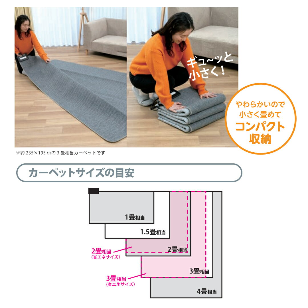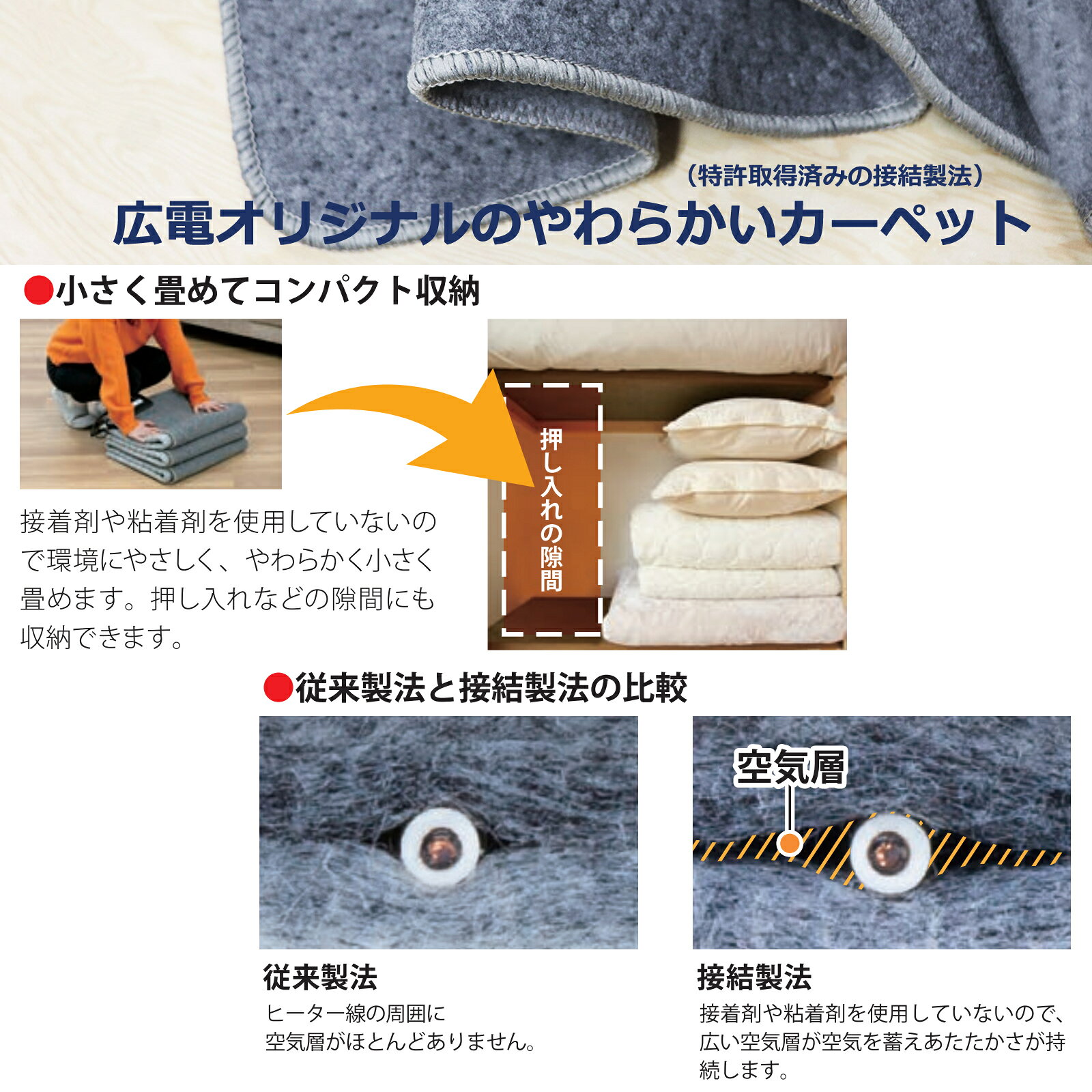 広電 電気カーペット 単体 省エネサイズ2畳 小さくたためる 特許取得済の接結製法 ※電気カーペットには、必ずカバーをかけてご使用ください 【製品仕様】 型式/品番 VWU201UH 本体サイズ外形寸法 省エネ2畳相当 約168×168cm 本体質量 約 2.4 kg 暖房面切換 2面3通り 消費電力 400 W 表面温度 強:約45℃、中:約38℃ 消費電力量(1時間あたり) 強:約211Wh、中:約189Wh 電気代(1時間あたり) 強:約6.6円、中:約5.9円 材質 表面材質:ポリエステル100% 電源コード 約1.4m 保証期間お買い上げ日より メーカー保証1年 特徴 特許取得済の接結製法でやわらかくて小さくたためる 省エネ2畳タイプの電気カーペット ■消費電力量 約37%ダウンの省エネタイプ**当社従来品との比較 ■接着剤不使用の「接結製法(特許取得済)」で、小さくたためてコンパクトに収納 ■約8時間で自動的に電源を切る、切り忘れ防止機能搭載 ■2面3通りの暖房面切換搭載 ※必ずカバーをかけてご使用ください ギフトラッピング 対象外(メッセージカードは無料にて承ってます) 関連キーワード 頭寒足熱(ずかんそくねつ)」について頭を涼しく保ち、足を温かくすることで体のバランスを整える健康法です。頭が熱いと眠りが浅くなりやすく、逆に足先が冷えると血流が悪くなり体全体が冷えてしまいます。そこで、上半身はすっきりと涼しく、足元はしっかり温めることで血の巡りが良くなり、リラックスして快適にお休みいただけます。寝具選びや就寝時の工夫に取り入れると、ぐっすり眠りやすくなります。 関連商品
