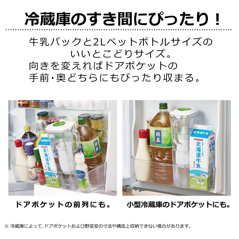 保証情報 等 ▼東レ トレビーノ ポット型浄水器 1.2L PT306SV 【生産国】日本 すき間にぴったりコンパクト。時短&高除去カートリッジ搭載であっという間にすぐおいしい。取っ手付きで収納性も抜群です。 ●時短浄水 高い除去性能とおいしさはそのままに、さらに浄水スピードUPを可能にするSVカートリッジ。 使いたいときにサッと浄水できるので、待ち時間や残量を気にせずに使えます。 *1 水質・水温や季節、地域、注ぎ方などの使用状況により、ろ過に時間がかかったり早まったりする場合があります。 *2 東レ調べ 2018年3月現在JIS12項目以上クリアの家庭用ポット型浄水器において。 ●冷蔵庫のすき間にすっきり!ぴったり! 牛乳パックと2Lペットボトルサイズのいいとこどりサイズ。向きを変えればドアポケットの手前・奥どちらにもぴったり収まる。 ※冷蔵庫によって、ドアポケットおよび野菜室の寸法や構造上収納できない場合があります。 ●カートリッジ交換目安表示 フタにあるダイヤルでカートリッジ交換時期を設定。10日単位で表示されるので、交換目安日がひと目でわかります。 品番 PT306SV JANコード 4960685893631 外形寸法 高さ292mm/幅151mm/奥行86mm 本体重量(満水時) 482g(1,282g) 材料の種類 本体容器・ロート:AS樹脂、フタ・ダイヤル:ABS樹脂、注ぎ口:ポリプロピレン、カートリッジ:ABS樹脂、ポリプロピレン ろ材の種類 活性炭、イオン交換体 ろ過流量 0.3L/分 ろ過水容量 0.8L 浄水能力*1*2*3 ・遊離残留塩素:総ろ過水量200L,除去率80% ・総トリハロメタン:総ろ過水量200L,除去率80% ・溶解性鉛:総ろ過水量200L,除去率80% ・2-MIB(カビ臭):総ろ過水量200L,除去率80% ・CAT(農薬):総ろ過水量200L,除去率80% ・テトラクロロエチレン:総ろ過水量200L,除去率80% ・トリクロロエチレン:総ろ過水量200L,除去率80% ・クロロホルム:総ろ過水量200L,除去率80% ・ブロモジクロロメタン:総ろ過水量200L,除去率80% ・ジブロモクロロメタン:総ろ過水量200L,除去率80% ・ブロモホルム:総ろ過水量200L,除去率80% ・陰イオン界面活性剤:総ろ過水量200L,除去率80% ・フェノール類:総ろ過水量200L,除去率80% ・ジェオスミン:総ろ過水量200L,除去率80% ・シス-1,2-ジクロロエチレン及び トランス-1,2-ジクロロエチレン:総ろ過水量200L,除去率80% ・ベンゼン:総ろ過水量200L,除去率80% ろ材の取替時期の目安*4 1日3L使用の場合 2ヶ月 1日2L使用の場合 3ヶ月 *1 日本工業規格:JIS S 3201 試験結果 *2 商品の浄水能力は、JISの試験方法で定められた条件下で各項目毎に計測した浄水能力を個別に表示したものです。 *3 商品の浄水能力は、JIS S 3201:2019 に基づいて測定した結果を表示しています。すでに販売済みの商品は本表示と異なる場合があります。 *4 実際の水道水の水質やろ過流量などの違いによってろ材の取換時期の目安は変わることがあります。 ◆運営会社「ホームショッピング」は1986年創立のショップです◆ 当店では、誕生日・クリスマスなどのプレゼントで喜ばれるオススメの商品を豊富に取り揃えております。 お子様/お孫様から大好きなパパ/ママ/おじいちゃん/おばあちゃんへ。 旦那様から奥様、奥様からご主人様へと幅広いプレゼントに。 また、父の日/母の日/敬老の日/就職祝い/結婚祝い/新築祝いなどのプレゼント用、ビジネスシーンやプライベートシーンなどのご自宅用でご使用いただけるアイテムなど様々なシーンに対応させていただきます。 ご自宅用(自家用)でお探しのお客様も、新生活/新婚生活/新入学/新社会人/などで役に立つ商品もたくさん取り揃えております。 彼氏/彼女 誕生日プレゼント(バースデープレゼント/誕プレ)や バレンタインデー/ホワイトデー、クリスマスプレゼント(クリプレ)などで商品をお探しの方は当店を是非ご利用ください。