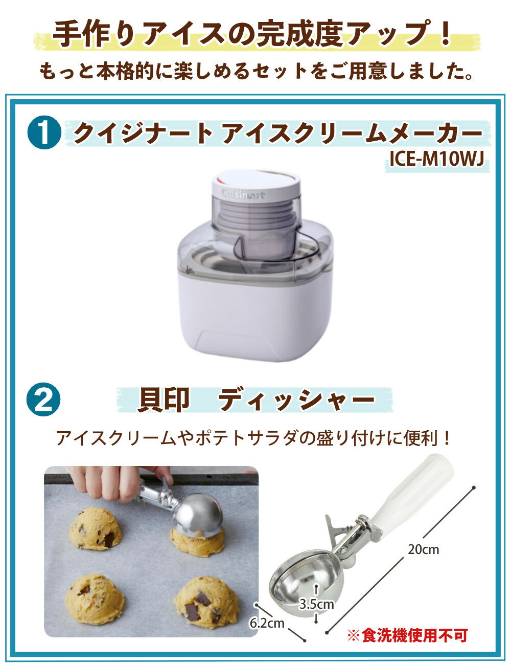 セット内容 1)クイジナート アイスクリームメーカー ICE-M10WJ 【メーカー保証】1年間 2)貝印 ディッシャー DH8115 食洗機について フタ、パドル、ボウル受けパーツのみ 食洗機 対応 です 食洗機可 食洗機OK 食器洗い乾燥機対応 食器洗い乾燥機可 食器洗い乾燥機OK 食洗器対応 食洗器可 食洗器OK 食器洗浄機対応 食器洗浄機可 食器洗浄機OK クイジナート アイスクリームメーカー ICE-M10WJ コンパクトでも容量たっぷり! 手作りアイスがボタン1つで作れるアイスクリームメーカー 季節を問わず人気スイーツのひとつであるアイスクリーム。 クイジナート「アイスクリームメーカー」は、お好みのフレイバーでアイスクリーム作りが家庭で手軽に楽しめます。 ●材料を入れてスイッチオン ボウルを冷凍庫で冷やし、材料を入れてスイッチを押すだけ。約20〜25分でアイスクリームの出来上がり! ●好きな材料で作れる 牛乳や豆乳、低脂肪乳、アレルゲンフリー素材など、お好みに合わせて自分だけのオリジナルアイスが作れます。 ●アイスクリームカップ(110ml)約4個分が1度にできる 最大出来上がり量は約480mlで1度にたっぷり作れ、家族分やストック分も作れる十分なサイズ感です。 ※材料、レシピにより異なります。最大調理量は約350ml。出来上がりは空気を含むため体積が増えます。 ●冷凍庫でも場所を取らないコンパクトな保冷ボウル 保冷ボウルは使用前に冷凍庫で約16〜24時間冷やします。 外径約15cm×高さ約10cmで、なかなか場所を確保しづらい冷凍庫でも使いやすいサイズです。 内部の液状保冷剤によって、材料をすばやく保冷・冷却を行います。 ●レシピブック付き 定番のバニラからラムレーズンやシャーベットなど、家庭で手軽に作れるオリジナルレシピを載せた専用レシピが付属。 アイスクリームはもちろん、シャーベットやジェラートも、アレンジ自在でさまざまなアイスを楽しめます。 製品名アイスクリームメーカー 品番ICE-M10WJ セット内容モーター部、ふた、パドル、保冷ボウル、ボウル受け、本体ベース 電源AC100V 50/60Hz 消費電力8W 外形寸法(約)幅180mm、奥行168mm、高さ200mm 質量(約)1,420g 定格時間30分 コードの長さ(約)1.5m(有効長) 貝印 ディッシャー DH8115 アイスクリームだけでなく、ポテトサラダなどの盛り付けにも便利なディッシャーです。 材質 本体:アルミニウム合金 ハンドル:ポリエチレン(耐熱温度80℃) レバー(ギア)部:ポリアセタール(耐熱温度140℃) サイズ 約 200×62×35mm 重量 約 81g 生産国 台湾 アイスクリームマシン アイス作る機械 アイスメーカー ソフトクリーム かき氷 アイスすくうやつ アイスすくう道具 アイスクリームすくう道具 球状にすくう アイスクリームディッシャー ジェラート アイスミルク ラクトアイス アイススクープ 氷 氷菓