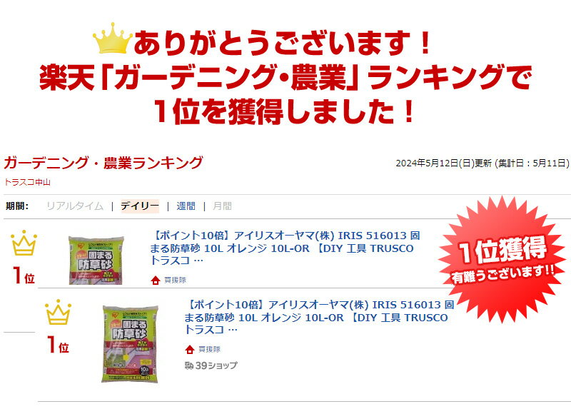 納期について:メーカー直送品(代引き不可)【DIY 工具 ツール トラスコ中山 オレンジブック TRUSCO 工事book トラスコ 庭 防草 砂 水 土 除草 対策 防草砂 ぼうそうすな 雑草対策 水通す 駐車場 固まる土 サンド】メーカー名:アイリスオーヤマ(株)【 特長 】・水をかけるだけで約24時間で固まる防草砂です。・薬品不使用にて、環境にも優しいです。【 用途 】・防草に。 仕様品名 IRIS 516013 固まる防草砂 10L オレンジ品番 10L-OR容量(L) 10色 オレンジ容量(g) 110001m[[の2乗]]あたり約3〜4袋が目安【 材質/仕上 】セメント、珪砂、顔料質量 11kgJANコード 4905009826995