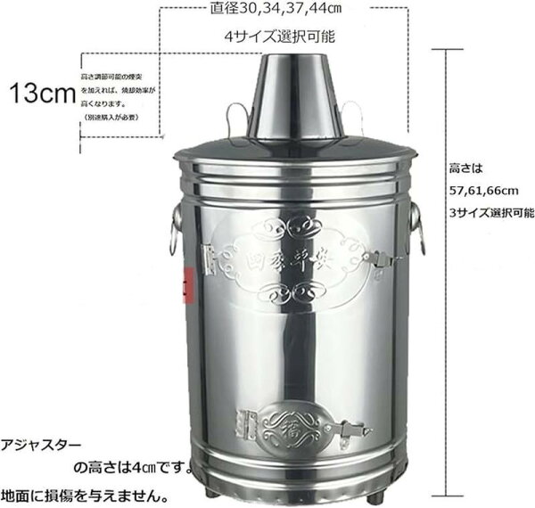 焼却炉の素材:100%ステンレス製 板厚:0.6cm〜0.8cm(他社商品と比べ、板厚が0.2cm厚いため、長期間使用できます。) 焼却炉に高さ調節可能の煙突を加えれば、焼却効率が高くなります。(別途購入が必要) アジャスター付き、地面に損傷を与えません。 軽量化を設計した焼却炉で、持ち運びが便利です。 ご注意(免責)>必ずお読みください 【注意事項】 使用前、焼却器の中に危険な物や生き物が入っていないか確認をしてください。 プラスチック及びビニールは燃やさないで下さい。 また、紙くずなどの家庭ゴミも燃やせません。 落ち葉や剪定枝はできるだけ乾燥させてから焼却してください。 (ぬれた状態で燃やすと大量の煙が発生します) 煙や臭いなどで近隣住民の迷惑にならないように配慮してください。 行政などから指導がある場合があります。 焼却中は焼却器のそばから離れないでください。 投入や灰のかき出しの際は、手袋を着用してください。 使用中は、消火用の水などを用意してください。 長期間使用しますと素材の劣化(サビ)が進み、もろくなり破損等のおそれがあります。 そのまま使用しますと危険ですので使用しないでください。 落ち葉や剪定枝を焼却した灰はアルカリ性を示し、家庭菜園などに活用できますが、灰を処分する場合は、必ずお住まいの市町村に確認の上、適正に処分してください。