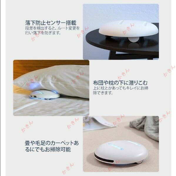 商品仕様 商品名:布団ロボット 本体サイズ:16*16*5cm パッケージ:19*19*7.8cm 重量:390g 入力:5V/1A(Max) 出力:5V/1A 消費電力:2.1W(手持ち式)、3.4W(自動式) UV周波数:253.7nm 電池容量:4800mAh 充電時間:0.5H 使用時間:2H ■落下防止センサー搭載。段差を検出すると、ルート変更を行い落下を防ぎます。 ■布団や枕の下に潜りこむ。上に枕とかあってもキレイにお掃除できます。 ■吸引+UVランプ照射でアレル物質などダニや細かいホコリを除去?除菌。さらに温風機能を搭載しました。 ■洗練されたデザイン、重さはわずか390g。 軽量?コンパクトで扱いやすいのが特徴です。