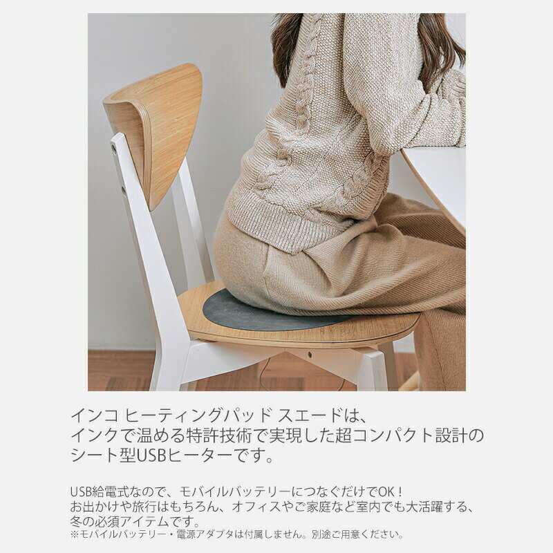 母の日 ギフト 父の日 ギフト 敬老の日 ギフト クリスマス ギフト お正月 子供の日 ギフト バレンタインデー ギフト ホワイトデー ギフト 可愛い おしゃれ オシャレ パーティー 入学祝い ギフト 卒業祝い ギフト 結婚記念日 ギフト お歳暮 ギフト お中元 旧正月 春節 お誕生日 などのプレゼントに ひまつぶし大変申し訳ございませんが のし 包装は対応いたしておりません。 INKO USB Heating Pad Suede インコ USBヒーティングパッド 人工スエード USB給電 薄型■商品詳細インコ ヒーティングパッド スエードは、インクで温める特許技術で実現した超コンパクト設計のシート型USBヒーターです。USB給電式なので、モバイルバッテリーにつなぐだけでOK!お出かけや旅行はもちろん、オフィスやご家庭など室内でも大活躍する、冬の必須アイテムです。※モバイルバッテリー・電源アダプタは付属しません。別途ご用意ください。世界初!インクで温めるUSBヒーター特許技術電熱線に代わる銀ナノインクによる世界初の温熱マット特許技術が実現した、新たな暖房グッズです。なぜ銀ナノインク?銀ナノインクは通電することで熱エネルギーが発生し、熱を帯びます。導電性に非常に優れており、一般的な電熱線を使用するシートヒーターより、素早く安全に発熱することができます。インクだから軽くて、薄い厚さ1.5mm、重量92g。 電熱線に代わりインクを使うことで軽量かつスリムなデザインを実現しました。薄さを追求したデザインで、ポケットにサッとしまえます。毎日の出勤やちょっとしたお出かけ、スポーツ観戦、旅行など様々なシーンで気軽に持ち運びができます。線ではなく面を温める技術、すぐ温まる最大9Wの低電力で、約1分で40℃以上に温まります。シート全面に印刷された銀ナノインクが同時に発熱することで、広い発熱面積を備えています。※本製品は保温材を使用しない超スリム製品です。その特性上、本製品を単独で使用した場合、熱損失現象により発熱温度が低く感じられる場合があります。薄布などと併用すると、効率よく発熱の効果が得られます。ワンタッチ簡単操作、USB接続ワンタッチコントローラーを搭載。簡単に電源のオン/オフと温度調節が可能です。LEDランプでは温度レベルの確認ができます。使用の際に感覚的に操作できるよう設計されたコントローラーです。USB給電式なので、モバイルバッテリーにつなぐだけでOK!海外出張など世界各地でも、コンセントの形や電力などの心配もなくお使いいただけます。また、ケーブル部分をまとめられる、便利なベルトタイが付属しています。ケーブルがごちゃごちゃと絡まる心配がなく、持ち運びの際にも収納がスムーズです。※各段階の温度は、使用環境により異なります。肌ざわりのよいプレミアム人工スエード素材柔らかく触り心地のよい人工スエードを採用。低刺激で毛玉になりにくく、保温性に秀でています。体の動きに無理なく沿うため、屈曲などが原因の製品劣化を防ぎ、耐久性にすぐれており、長くご使用いただけます。汚れにも比較的強い素材で、水濡れなどの際も、布やティッシュで汚れを拭いたあとに自然乾燥させるだけでOK。お手入れも簡単です。※ 本製品は洗濯できません。汗や水などで濡れてしまった場合は自然乾燥させてください。5つの安全・安心機能1. 電気の無駄使いを防ぐ電源自動OFFシステム電源を入れてから約12時間経過すると自動で電源がオフになるセーフティー機能を搭載。長時間使用の際や、電源を切るのを忘れてしまった場合にも安心です。2. 過熱時電源遮断システムでやけどや火災を防止マットと電線を連結するカバー部分に過熱防止センサーを内蔵。70度以上にまで過熱が進んだ場合、電源が自動でOFFになるように設計されています。遮断システムが作動しても、温度を低下させ電源を入れ直せば再び使用できます。3. 温度コントロールセンサー搭載で過熱防止温度コントロールセンサーを搭載。設定温度ごとに過熱が発生しないように電力を分配して、温度を調節します。4.低温設定が可能ヒーティングマットは、長時間連続で使うと熱く感じる場合があります。3段階調節が可能なので、長時間使用の場合、低温に設定することで低温火傷を防ぎます。※低温であってもやけどの恐れがあるため、同じ部位への連続使用は危険です。ご注意ください。5. スマートセルフヒューズシステムで火災防止過度な負荷や製品内部で150度以上の過熱が進んだ場合、ヒューズが切れる「スマートセルフフューズシステム」という機能が搭載されています。電熱線を用いた一般的な製品の場合、高温限界を超えると熱線が溶け、火災が発生するリスクがあります。INKOのヒーティングマットは発熱体が200と非常に薄く、高温限界を超えたときには周りのフィルムが収縮し、自動的に断線(セルフヒューズ)されるので、火災につながるリスクを遮断します。※ スマートセルフヒューズシステムは緊急停止装置のため、緊急停止の後に本製