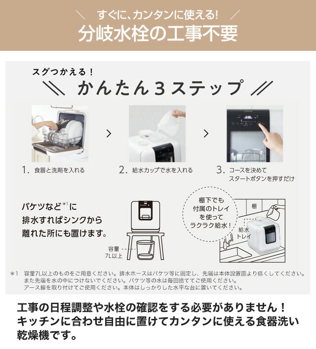 【キーワード】卓上食洗機 食器洗い機 食器洗い乾燥機 / 【 DWS-33A-W の後継品 】DWS-33B-W 商品説明カラー ホワイト仕様・特徴 自由に置ける「タンク式」食器洗い乾燥機。工事不要 食器洗い乾燥機 容量:18点タンク式電源:交流100V 50Hz/60Hz共用最大消費電力(50Hz/60Hz):725W/745W運転音(50Hz/60Hz):約41dB/約43dB庫内容積:約31L使用水量:約6L洗浄方式:回転スプレーアーム噴射式+天井ノズル噴射式すすぎ方式:ためすすぎ(3回)乾燥方式:ヒーターとファンによる強制排気乾燥サイズ 外形寸法:420(幅)×435(奥行)×465(高さ)mm重量 約13kg付属品UV除菌専用たな、小物入れ、給水カップ(1.8L)、排水ホース(1.5m)、給水トレイ、保証書付き取扱説明書発売日 2025年7月旧品番 DWS-22A → DWS-33A-W の後継品