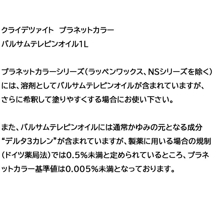 KREIDEZEIT バルサムテレピンオイル 1リットル ブラジル、地中海沿岸の松根油から精製したテレピンオイル バルサムテレピンオイル 1リットルプラネットカラーシリーズ(ラッペンワックス、NSシリーズを除く)には、溶剤としてバルサムテレピンオイルが含まれていますが、さらに希釈して塗りやすくする場合にお使い下さい。また、バルサムテレピンオイルには通常かゆみの元となる成分“デルタ3カレン”が含まれていますが、製薬に用いる場合の規制(ドイツ薬局法)では0.5%未満と定められているところ、プラネットカラー基準値は0.005%未満となっております。 2