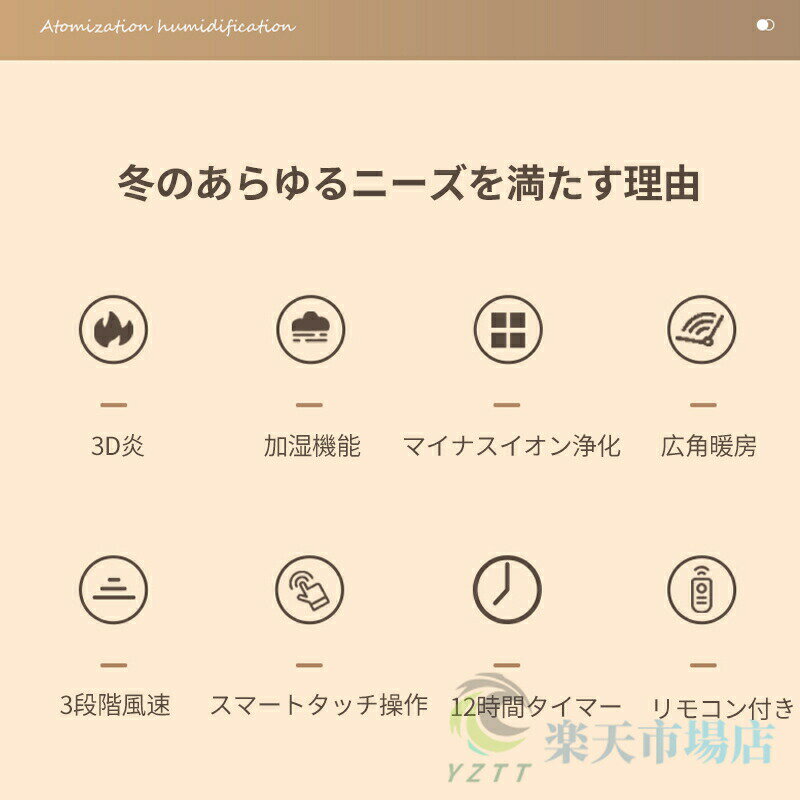 商品情報【パッケージ】電源:AC110V(50/60Hz)定格消費電力:2000W水タンク:300ml切タイマー:12H時間自動首振りリモコン付き12時間オートOFF機能風量切替:3段階最大加湿時間:2Hサイズ:33 x 15 x 13 cm重量:1.65KGLED:冷風(ブルー)/暖風(レッド)メーカー保証:2年間保証【電気ヒーター】1.本電気ヒーターで顔、手、お腹、腰、膝、足元まで暖風を届き、しっかり対流が起きるためにお部屋全体がポカポカ!2.洗濯物が早く乾く!3.雨の日に濡れた靴梅雨の時の洗濯物の急速乾燥、ダニを殺し、寒い冬に布団衣類を温める!【 1台3役冷暖両用噴霧加湿空気浄化 】新しいタイプの扇風機は、技術のアップグレードとシンプルなボタンデザインにより、送風、涼風、暖風、加湿、空気浄化、噴霧加湿を一体にした冷暖兼用。【2秒速暖】2秒加熱が可能なセラミックヒーターは、快適な暖かさを瞬時に提供します。このヒーターは、セラミックを使用しており、高い熱効率を誇ります。電源を入れた瞬間から、すぐに心地よい暖かさが広がり、寒い季節でもすぐに温まることができます。また安全性を最優先に考えたこのヒーターは、倒れにくい設計が特徴です。誤って触れてしまった場合でも、安全装置が働き、事故を未然に防ぎます。このため、特に小さなお子様や高齢者がいる家庭にとって、安心して使用できる製品となっています。家族全員が安心して使えるように配慮されたこのセラミックヒーターは、心地よい暖かさだけでなく、安全性も兼ね備えています。【三段階の温度調節 】3段階の涼風、3段階の暖風が調整可能、三つのモードが選択可能!新しい扇風機の運転モードは、送風、涼風、暖風に切り替えることができます。涼風ファンを利用し、酷暑の日に氷を入れると、冷却効果が一段と高まります。涼風モードの風量は、弱、中、強の三つの段階で設定できます。暖風モードの風量は、弱、強の二段階で設定できます。涼風モードはエアコンよりもやさしく、扇風機よりも涼しく、暖風モードは伝統的な電気ストーブよりも安全で、部屋全体を素早く暖めることができ、子供、女性、高齢者など寒さに弱い人に適しています。【自動首振り機能】自動で左右 回転する機能があり、8~18畳の部屋に広い範囲の涼しさと暖房をもたらすことができます。暑い季節は涼しさが素早く部屋に広がり、寒い季節は暖房範囲を拡大し、隅々まで涼しく、暖かくすることができます。新しい扇風機には 1-12 時間のタイマーが内蔵されており、設定した時間で自動的にオフになり、夜間に静かで快適な環境を作るのに最適です。また、快適で爽やかな室内環境をお届けします。【使用時のご注意】空気流通性の考えにより、使用中には設備をもので覆わないでください。 稼働前、プラグがコンセントにしっかりと挿入されたことをご確認ください。 過負荷による製品損壊を避けるように同じコンセントで多数の家電製品を使用しないでください。 プラグ変換器で本製品を使用しないでください。【PSE認証&多重安全設計】複数の安全機能を備えているため、お客様のニーズに応えるために他のポータブル電気ヒーターよりも細部にまで気を配っています。「PSE認証済み」: 高い安全性を保証。「自転倒自動OFF機能」: 突発的な原因で転倒すると、ヒーターが自動停止。「過熱自動保護機能」: 暖房内部が過熱すると、サーモスタット、電流、温度ヒューズが電源を遮断。「V0級の難燃耐火素材」: 難燃性PTC素材を使用し、羽根なしセラミックファンヒーター ので、火傷も防ぎます。お子供とペットがいる家庭はご安心にお使いいただけます。【適応場所】店舗 ヘアサロン 美容室 理髪店 飲食店 居酒屋 レストラン カフェ バル バー ダイニングバー ホテル モデルハウス 喫茶店 ビジネスホテル 食堂 エステティックサロン ネイルサロン アパレルショップ 本屋 美術館 博物館 雑貨ショップ セレクトショップ インテリアショップ ヒーリングサロン コーヒーショップ商品情報【パッケージ】電源:AC110V(50/60Hz)定格消費電力:2000W水タンク:300ml切タイマー:12H時間自動首振りリモコン付き12時間オートOFF機能風量切替:3段階最大加湿時間:2Hサイズ:33 x 15 x 13 cm重量:1.65KGLED:冷風(ブルー)/暖風(レッド)メーカー保証:2年間保証【電気ヒーター】1.本電気ヒーターで顔、手、お腹、腰、膝、足元まで暖風を届き、しっかり対流が起きるためにお部屋全体がポカポカ!2.洗濯物が早く乾く!3.雨の日に濡れた靴梅雨の時の洗濯物の急速乾燥、ダニを殺し、寒い冬に布団衣類を温める!【 1台3役冷暖両用噴霧加湿空気浄化 】新しいタイプの扇風機は、技術のアップグレードとシンプルなボタンデザインにより、送風、涼風、暖風、加湿、空気浄化、噴霧加湿を一体にした冷暖兼用。【2秒速暖】2秒加熱が可能なセラミックヒーターは、快適な暖かさを瞬時に提供します。このヒーターは、セラミックを使用しており、高い熱効率を誇ります。電源を入れた瞬間から、すぐに心地よい暖かさが広がり、寒い季節でも