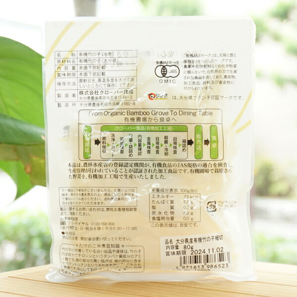 ■自社管理の有機竹の子圃場の竹の子を皮むき・カット・ボイル・袋詰めしております。 ■下茹で済みですので開封後はそのままお料理にご使用いただけます。 ■竹の子本来の香りがご賞味いただけます。 ■細切りタイプ。 ■有機JAS認証品。 ■本品は、農林水産省の登録認定機関が、有機食品のJAS規格の適合を検査し、生産管理が行われていることが認証された加工食品です。有機圃場で栽培された野菜を、有機加工工場で生産いたしました。 【原料名】有機竹の子(大分県) 【内容量】80g
